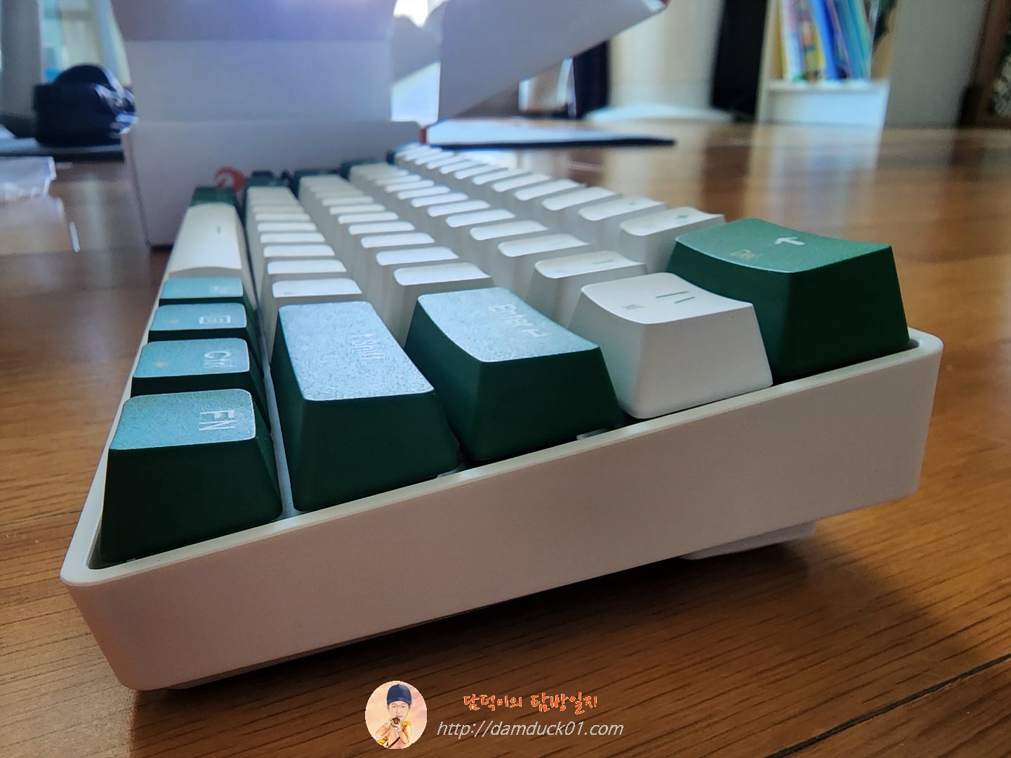 전체적으로는 흰색과 녹색으로 되어 있는데요. 메인(?) 키는 흰색으로 주변(?) 키는 녹색으로 디자인되어 있네요. 그리고 61 키 밖에 안 되는 미니 배열 키보드인 만큼 커서 키도 없고 백스페이스와 Del 키도 하나로 돼서 FN키 조합으로 이용해야 하고 Insert 키나 Home 키 End 키와 같은 키들 역시 FN키 조합으로 써야만 하는 처음 보면 엄청 불편한 거 같은 키보드입니다. 아! 그리고 요즘(?) 키보드답게 Windows와 Mac 호환이 가능한 키보드랍니다.