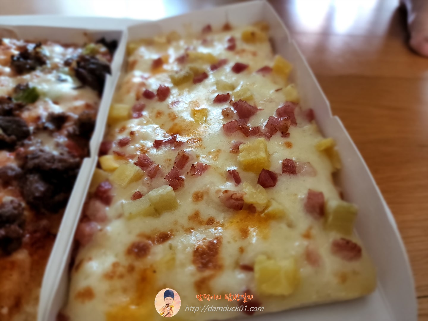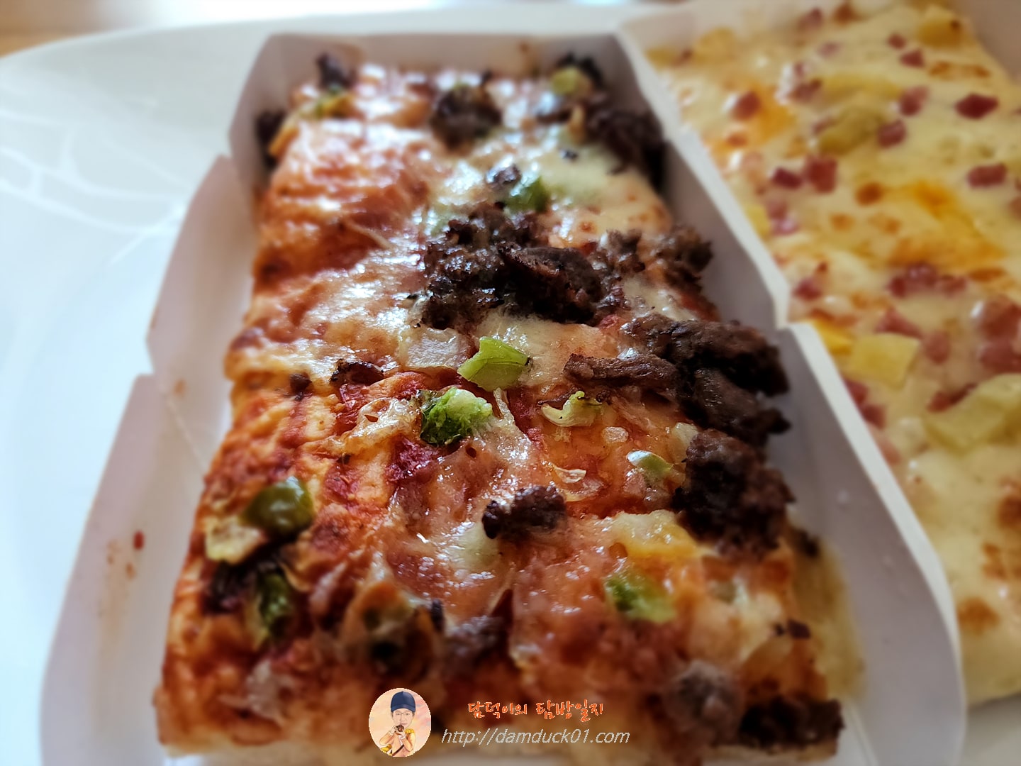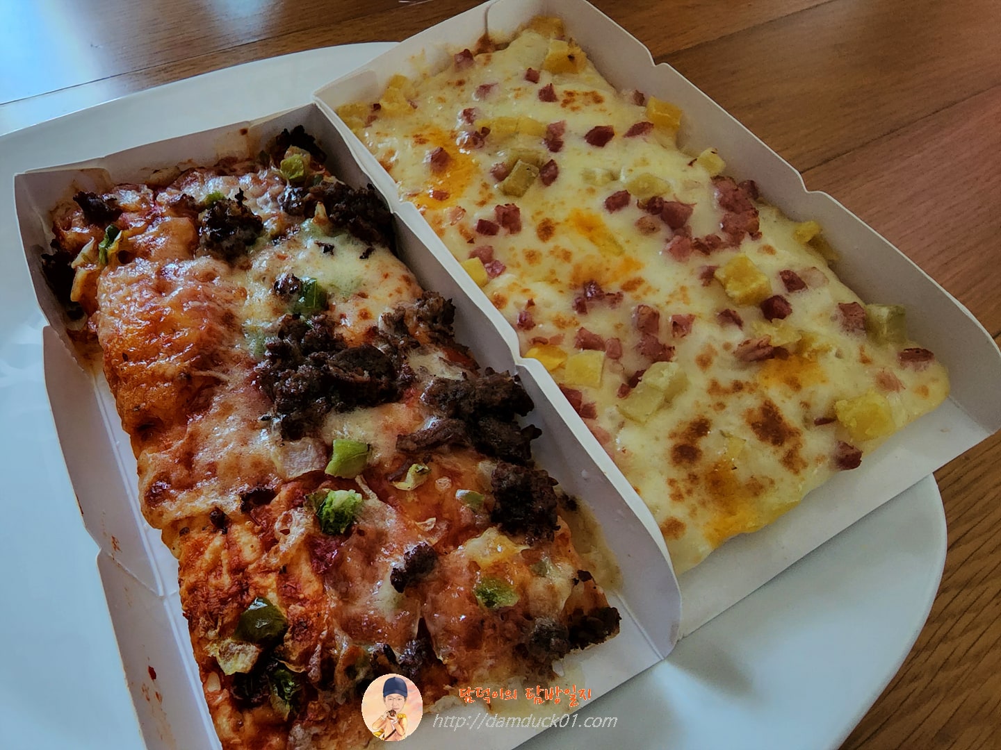 아내가 구매한 건 베이컨 고구마 피자와 비프 콤비네이션 피자 두 종류인데 이 두 가지 외에 콰트로 치즈 피자와 마르게리타 피자까지 총 4 종류가 판매되고 있는 거 같습니다.
