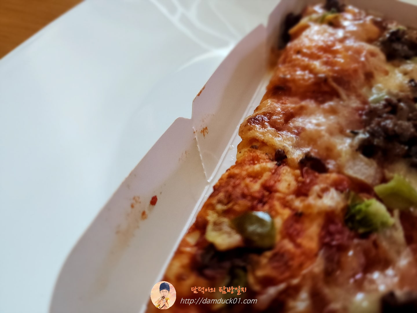 그래서 피자를 먹을 때 저 선을 따라 잘라서 먹으면 한결 먹기가 편하답니다. 그리고 우리 가족은 비프 콤비네이션 피자 하나와 베이컨 고구마 피자 두 개 이렇게 세 개를 한 번에 전자레인지에 돌렸는데 이게 치즈의 양 차이일까요? 같은 시간을 돌렸는데 베이컨 고구마 피자는 전체적으로 촉촉하고 부드럽게 잘 데워졌지만 비프 콤비네이션 피자는 조금 덜 돌렸으면 좋았을 거 같습니다. 이건 가정에서 사용하는 전자레인지에 따라서 조절하시면 좋을 거 같고 예전에 제가 먹었던 냉동피자와 비교하면 훨씬 훌륭합니다. 보기에도 푸짐했던 토핑도 좋았고 포카치아라는 빵을 먹어본 적이 없어서 정확히 어떤 차이가 있는지 모르겠지만 라쿠치나 냉동피자 도우도 색다르고 괜찮았어요.