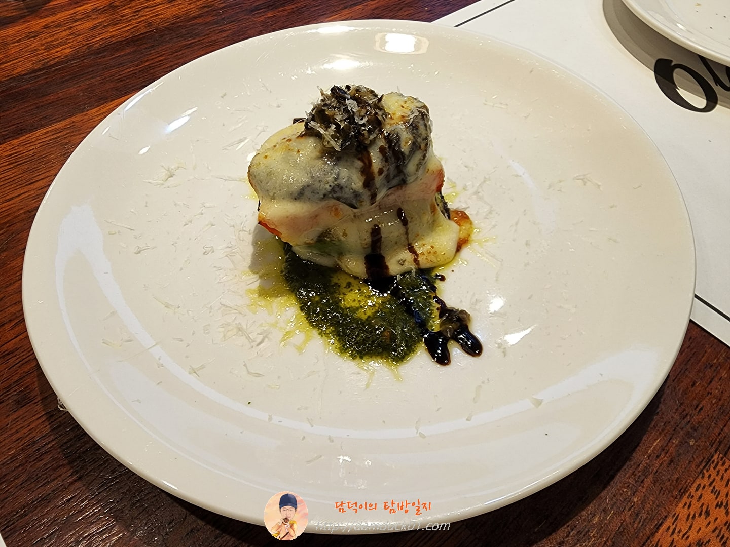 애피타이저가 나오기 시작합니다. 먼저 나온 건 꼬제인데요. 꼬제는 뉴질랜드 그린홍합 구이와 허브 마늘 소스래요. 이거 맛있네요.