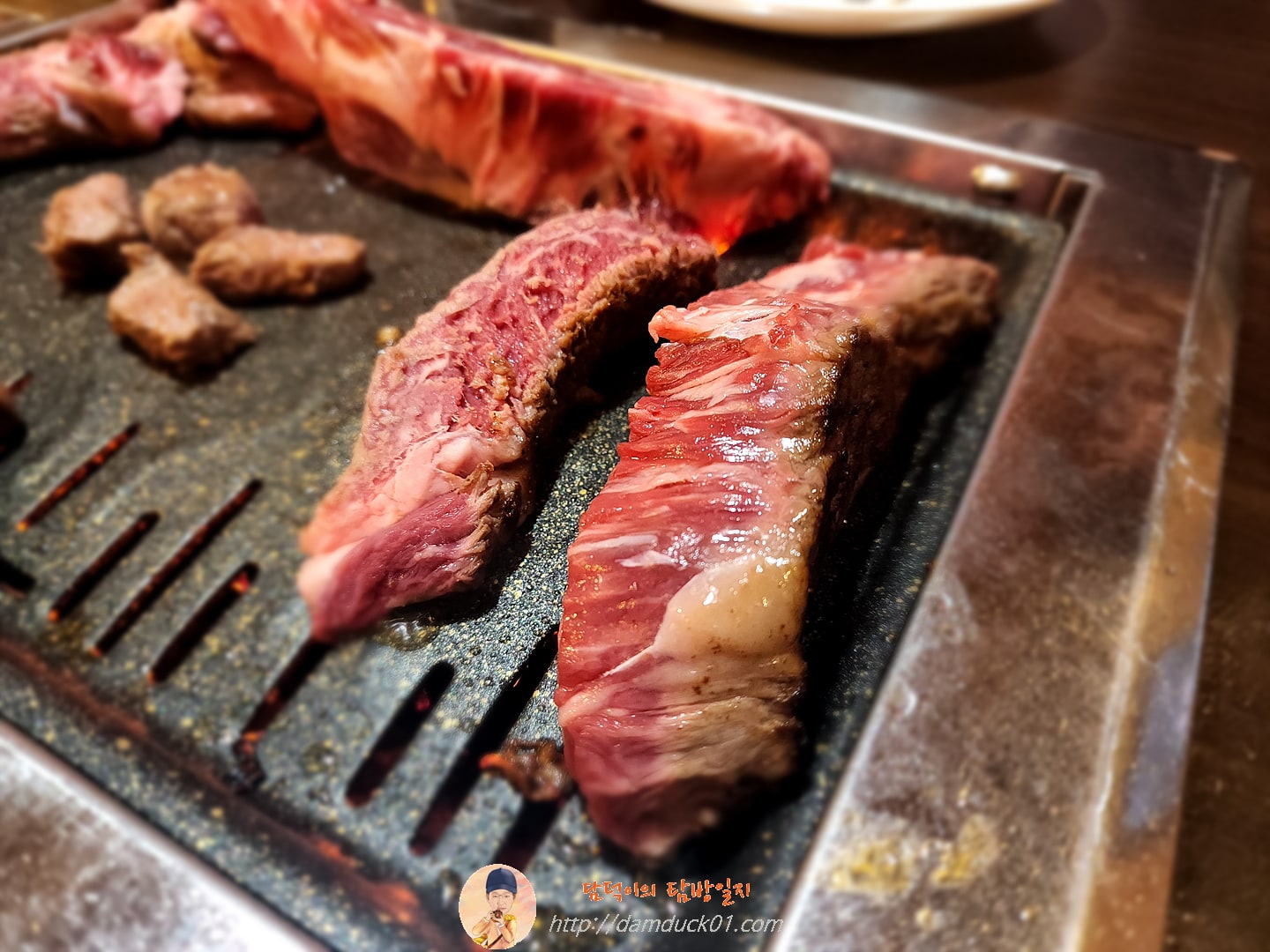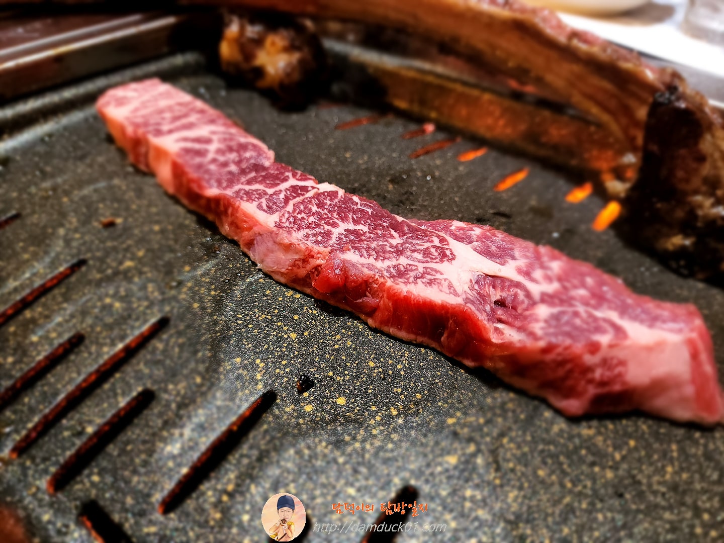 사장님 말로는 화우에서 가장 맛없다는 고기로 먼저 시작합니다. 그런데 여기 분위기나 사장님의 영업 스타일이 호불호가 나뉠 거 같네요. 고기를 전부 구워주는 것도 아니고 종류별로 첫 고기가 나올 때 고기에 대한 설명과 함께 사장님이 고기를 구워주고 굽는 방법을 알려주고 그리고 자리를 떠나시는대요. 그 설명하는 방법과 이게 사장님 말 안 들으면 역정도 내시고 그래서 처음에는 이게 뭔가 싶더라고요.