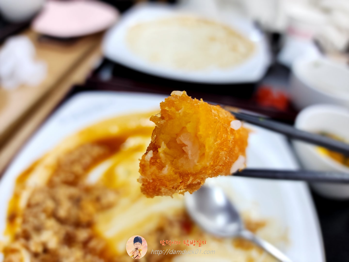 여기에 달걀 프라이, 소시지, 새우튀김 그리고 고로케도 추가했는데 고로케는 나중에 따로 나왔습니다.