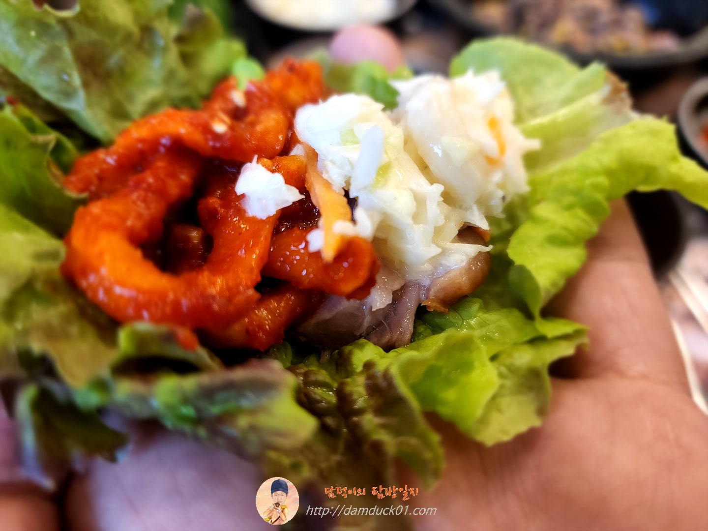 상추 위에 족발 한 점이랑 무김치 얹고 제가 좋아하는 양배추 샐러드도 얹어서 쌈 싸 먹어도 맛있고요.
