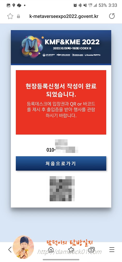 관람시간은 10:00 ~ 17:00까지이고 입장은 16:30까지 가능합니다. 입장절차는 사전 등록하는 방법도 있고 현장 등록해서도 가능한데 저는 현장 등록으로 다녀왔어요. 입구에 가시면 위와 같은 모바일 등록 안내라는 세움 간판이 있는데 스마트폰 카메라를 실행해서 QR코드를 찍고 나오는 화면으로 접속하면 개인정보 수집 항목에 등록하고 이름과 전화번호를 입력 후 다음 버튼을 클릭합니다. 그리고 추가 정보를 입력하고 저장 버튼을 클릭하면 "현장등록신청서 작성이 완료되었습니다."라는 페이지를 볼 수 있고 그 페이지의 QR코드를 등록 부스에서 스캔하면 팔찌가 인쇄되어 나오는데요. 이 팔찌를 받으면 등록 절차가 완료된 거니까 팔에 차고 입장하시면 됩니다.