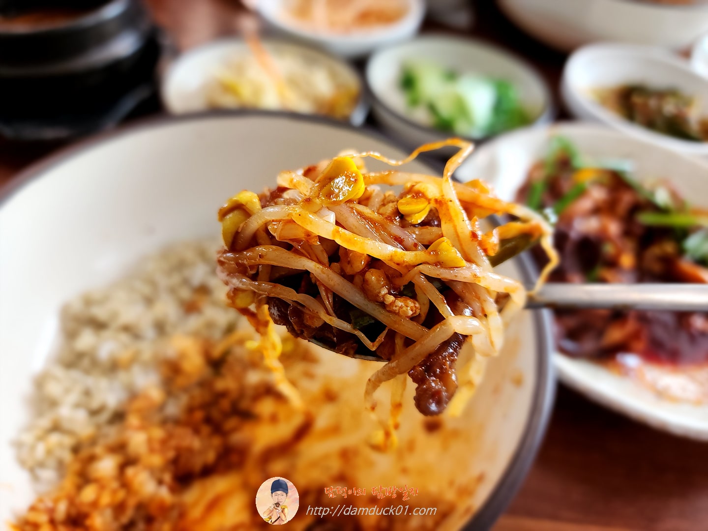 무생채도 넣고 콩나물도 넣고 슥슥 비벼서 또 한 입.