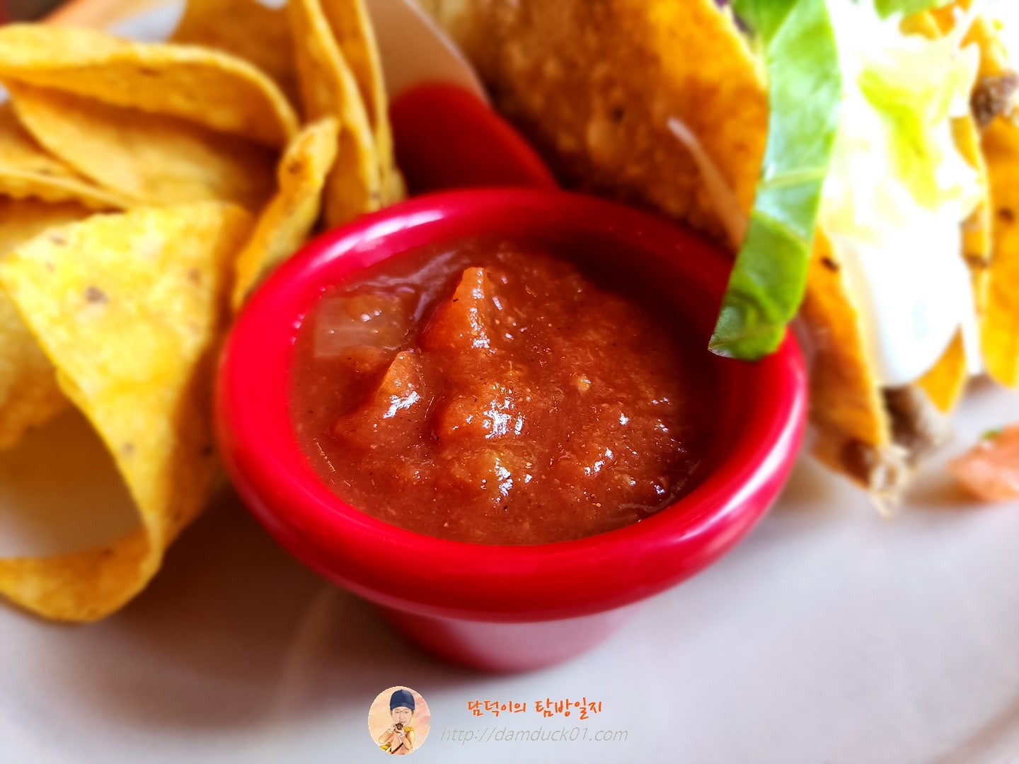 나초 먼저 소개하자면 그냥 나초죠. 사실 제가 나초를 그렇게 좋아하지 않아요. 아내는 나초를 좋아하던데 저는 그냥 바삭하게 부서지는 과자 느낌이랄까요? 바삭한 것보다 부드러운 식감을 좋아하는 저는 식감도 제 취향이 아니고 맛도 그냥 다른 과자가 더 맛있는 거 같아서 있으면 먹지만 굳이 찾아먹지는 않는 편이라 소고기 하드 타코에 나온 나초도 그저 그랬어요. 그런데 소스는 맛있었어요. 소스 맛으로 먹은 나초였습니다. 😅