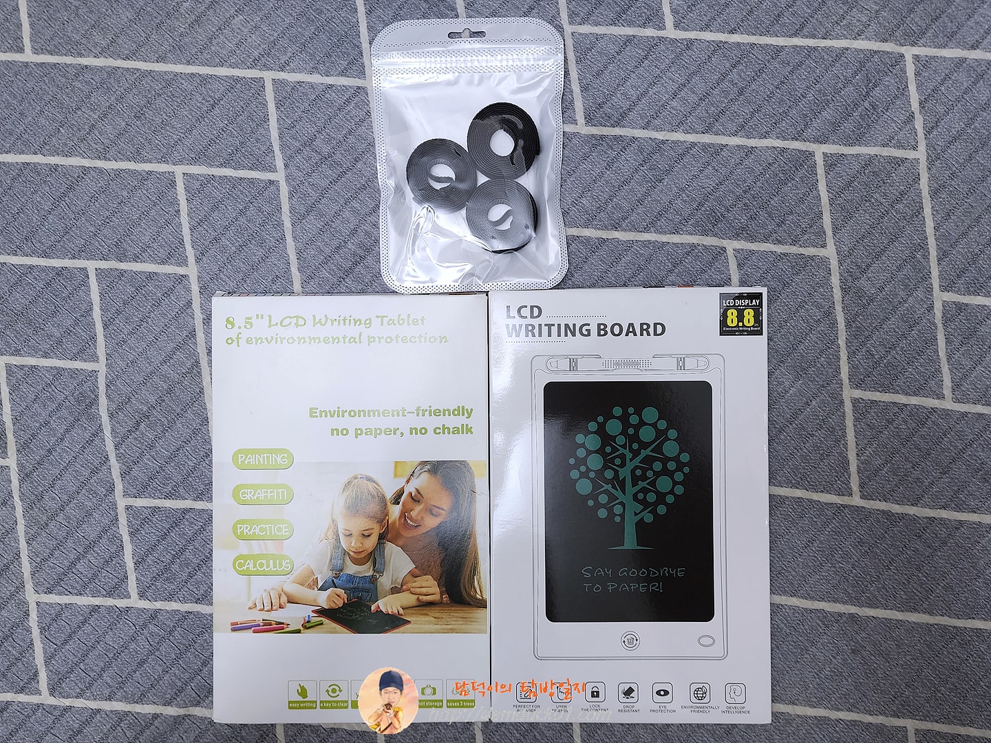 3개 묶음 제품이라서 두 개만 주문은 안 되잖아요. 그래서 LCD 전자 메모보드 2개와 케이블 정리용 벨크로 타이를 주문했어요. 그런데 주문한 LCD 전자 메모보드도 두 개가 달라요. 이번에 알았는데 3개 묶음 제품 구매 시 같은 제품은 주문이 불가능하네요. 그러니까 3개 제품이 모두 다른 것들로만 주문됩니다. 한 가지 제품을 2개 이상은 주문할 수 없어요. 그래서 전에 구매했던 것과 같은 LCD 전자 메모보드랑 다른 메모보드로 주문을 했어요.