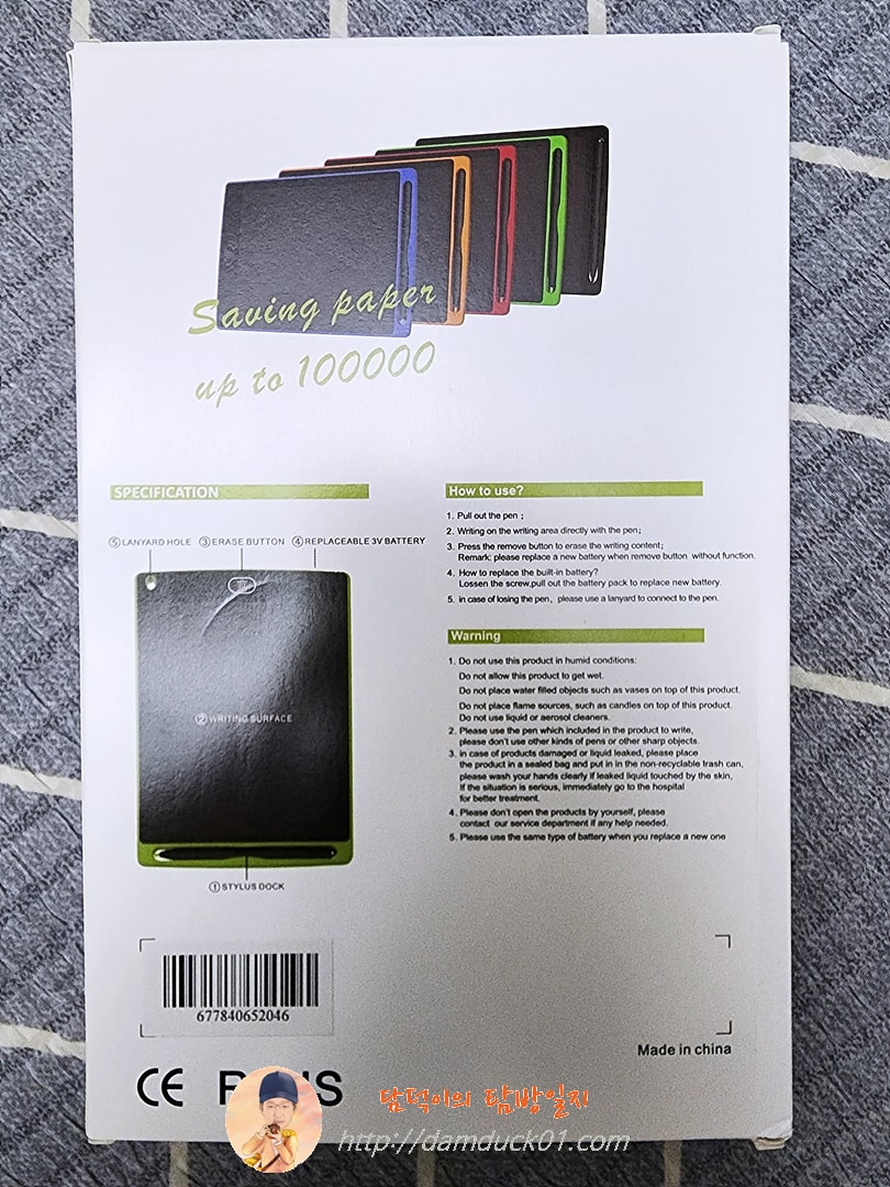 제품의 디자인이 살짝 다른 것도 같지만 전체적인 느낌이나 구성은 동일하네요. LCD 전자 메모보드 상단에 스타일러스 펜 수납이 가능한 구조로 되어 있는 점. 하단에 지우기 버튼이 있는 것과 뒷면에 지우기 버튼을 잠글 수 있는 스위치가 있는 점 그리고 수은 전지가 들어가는 구조까지 디테일에 차이가 있을 뿐 비슷한 구성으로 만들어져 있습니다. 아 그리고 이 제품도 사용되는 수은 전지의 타입은 CR2025로 동일해요.