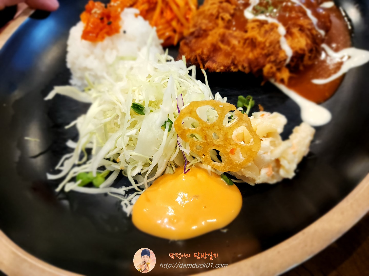 먼저 연근 튀김을 품고 있는 양배추 샐러드와 소스가 한쪽에 가지런히 자리하고 있고요.