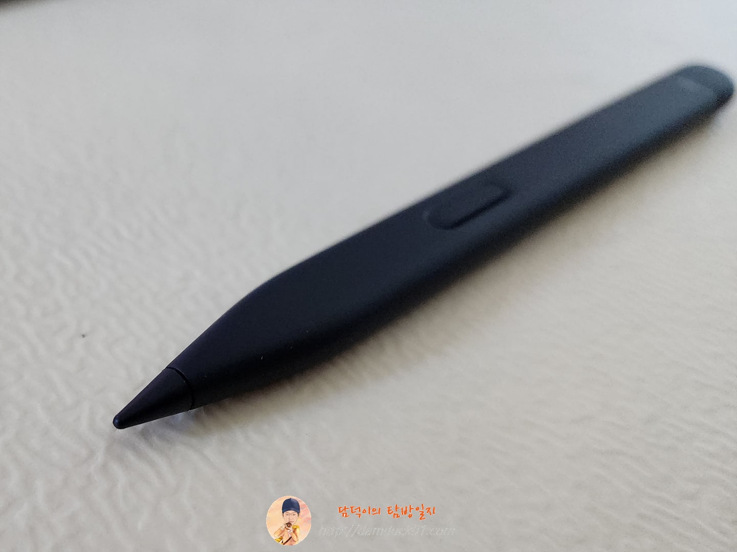 다음으로 슬림 펜 2인데요. 이전 서피스 펜보다 높아진 성능과 반응 속도 그리고 배터리가 내장형으로 바뀌고 디자인도 일반 펜 같은 형태가 아닌 납작해진 독특한 디자인으로 바뀌었어요. 이전 서피스 펜은 사용해 본 적이 없어서 잘 모르지만 저는 사용하는데 큰 불편은 없었습니다. 아직 그림을 그려본 적은 없고 메모 용도로만 사용해 봤는데요. S펜만 사용해 본 경험과 비교하면 약간 이질감이 있긴 하지만 제가 사용하는 용도로는 충분한 만족감을 느끼고 있습니다.