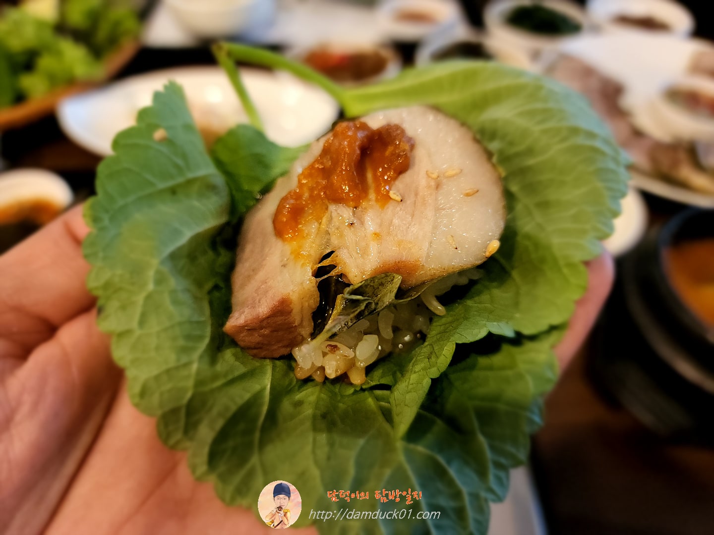 수육도 연잎으로 감싸서 삶은 후 연잎채로 썰어서 나오는 거 같죠? 수육 테두리가 연잎으로 감싸여 있어서 이걸 그냥 소스에 찍어먹어도 좋고 쌈채소에 다른 반찬과 함께 쌈 싸 먹어도 좋습니다. 맛있어요. 아이들이 연잎 때문에 연잎밥을 못 먹으면 어떡하나? 했는데 우리 아이들이 못 먹을까 하는 걱정은 쓸데없는 거라는 걸 새삼 깨달은 맛있는 연잎수육 쌈정식 A였습니다.