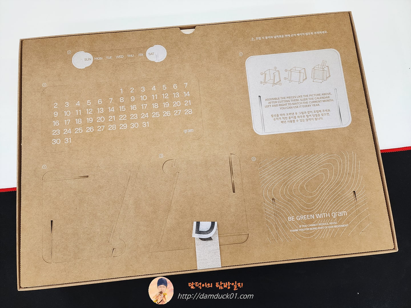 그럼 상자를 열어서 구성품을 알아봐야죠. 봉인 씰을 칼로 이쁘게 자르고 상자를 열면 그램이 먼저 나오는 게 아니고 위와 같이 달력 같은 조립식 종이가 먼저 보입니다. 조립을 하면 캘린더가 있는 연필꽂이가 되는 거 같은데 나중에 만들어야지 하면서 여태 안 만들고 있었네요. 다음 주 출근해서 바로 만들어야겠어요.