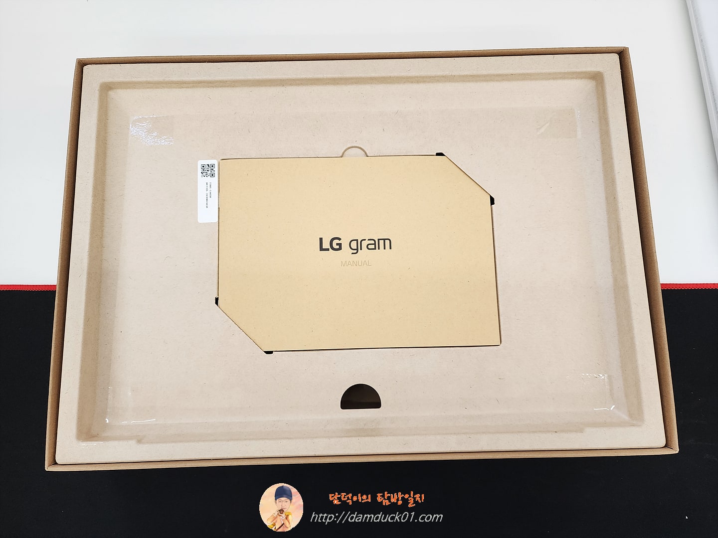 회사에서 사는 게 아니고 제가 직접 구매하는 거였다면 그냥 제품 그대로 구매하고 직접 업그레이드를 했을 텐데 조금 아쉽습니다. 아무튼 그램을 꺼내면 밑에는 설명서가 들어 있을 거 같은 작은 종이상자가 또 보이고 이것마저 꺼내면 바닥에 키보드 덮개와 기타 종이 안내문들이 바닥에 담겨 있어요. 그런데 LG gram이 적힌 설명서까지는 그래도 프리미엄, 플래그십 노트북 다운 패키지라고 생각했는데 바닥에 들어 있는 안내문과 키보드 덮개 패키지는 아쉬운 포장이군요. 흠~