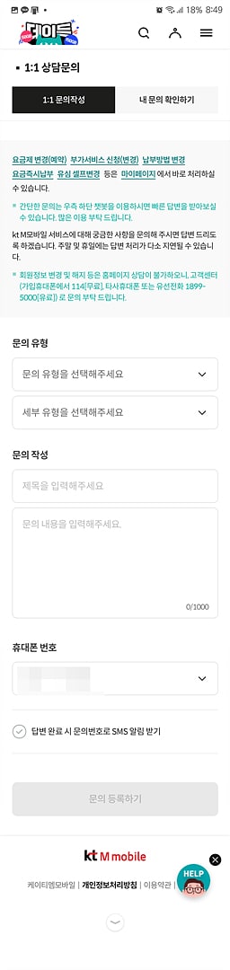 kt M모바일 앱에서 고객센터 > FAQ/고객문의 > 1:1 상담문의를 선택하시면 위와 같은 화면이 보이는데 여기서 문의 유형을 "신청/변경"을 선택하고 세부 유형은 "요금제 변경"을 선택하시면 문의 내용 입력 영역에 아래와 같은 내용이 나타납니다.