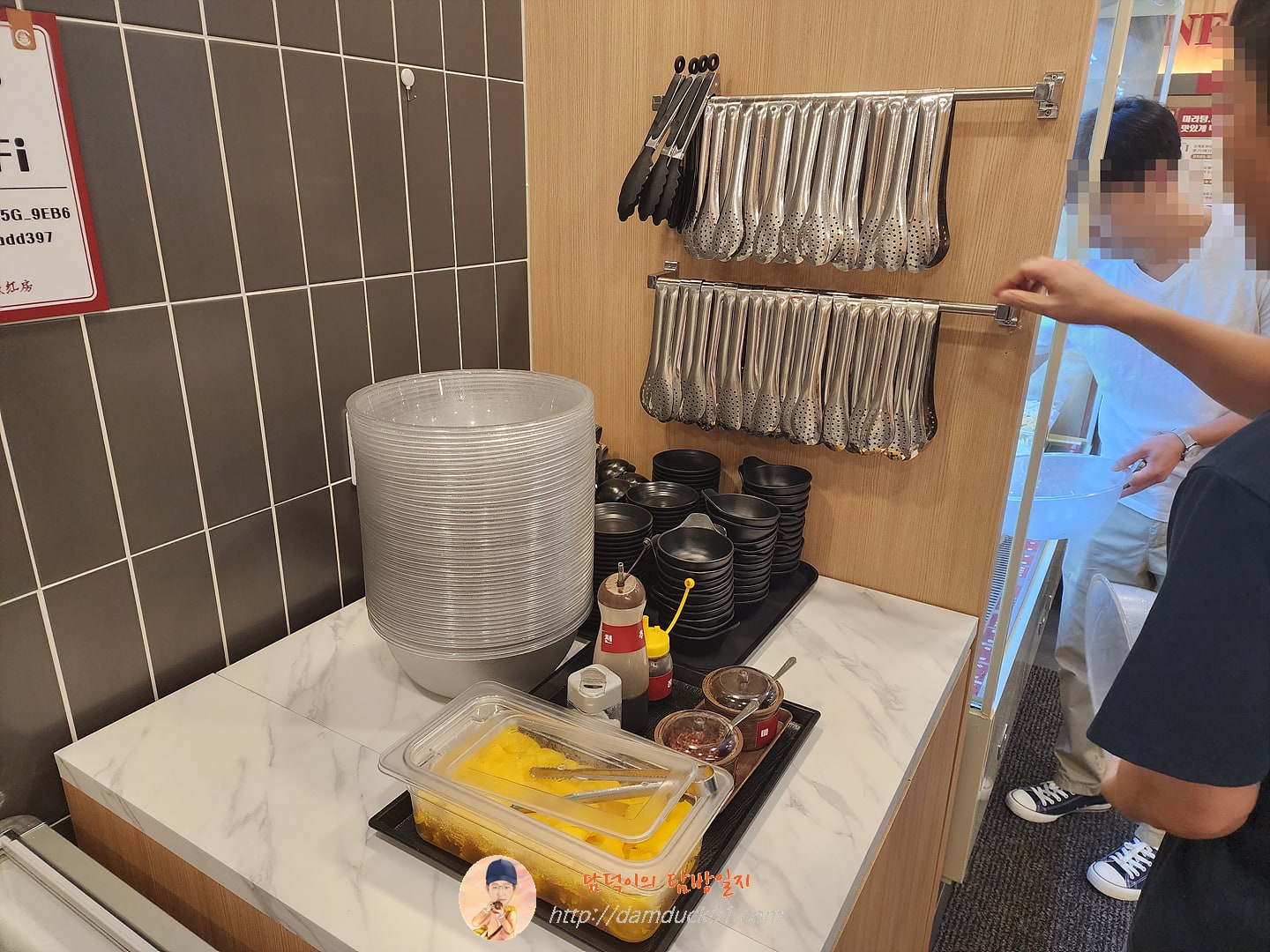 냉장 진열대 옆에 있는 반투명한 플라스틱 보울과 집게를 챙기고 음식을 담아봅니다.