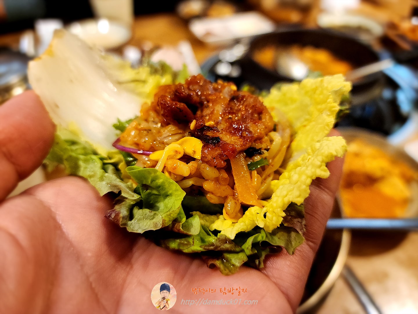 여기에 다양한 쌈 채소와 철판에 담겨 나오는 제육볶음 그리고 두툼한 수육까지 한 상 차려진 거 보면 화려하다는 표현이 잘 어울리죠? 😄