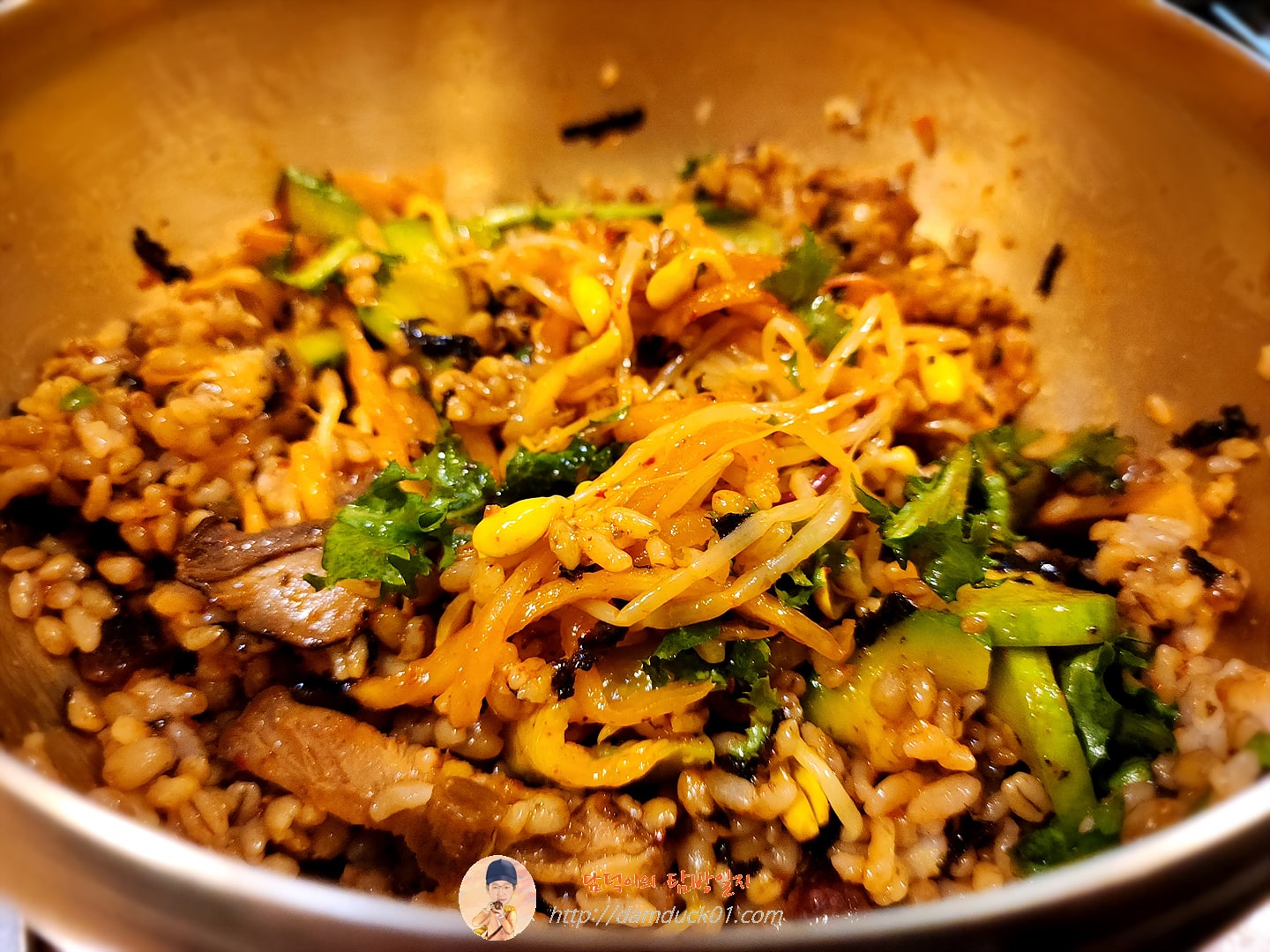 맛있게 비빈 보리밥 한 숟가락 그냥 먹어도 맛있고 청국장에 슥슥 비벼 먹어도 맛나요.