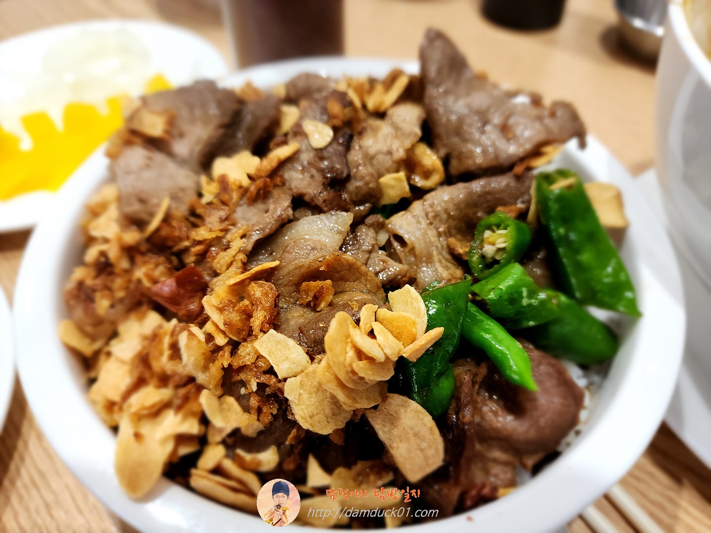 메뉴판에는 '돼지고기와 마늘, 양파 후레이크 촉촉한 덮밥'이라고 적혀 있었는데요.