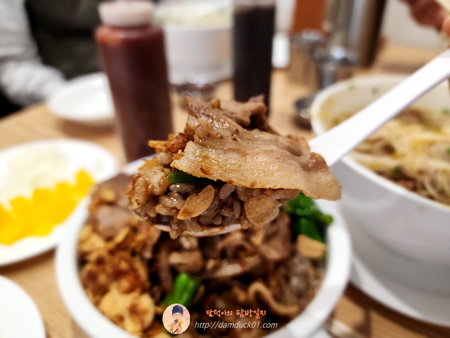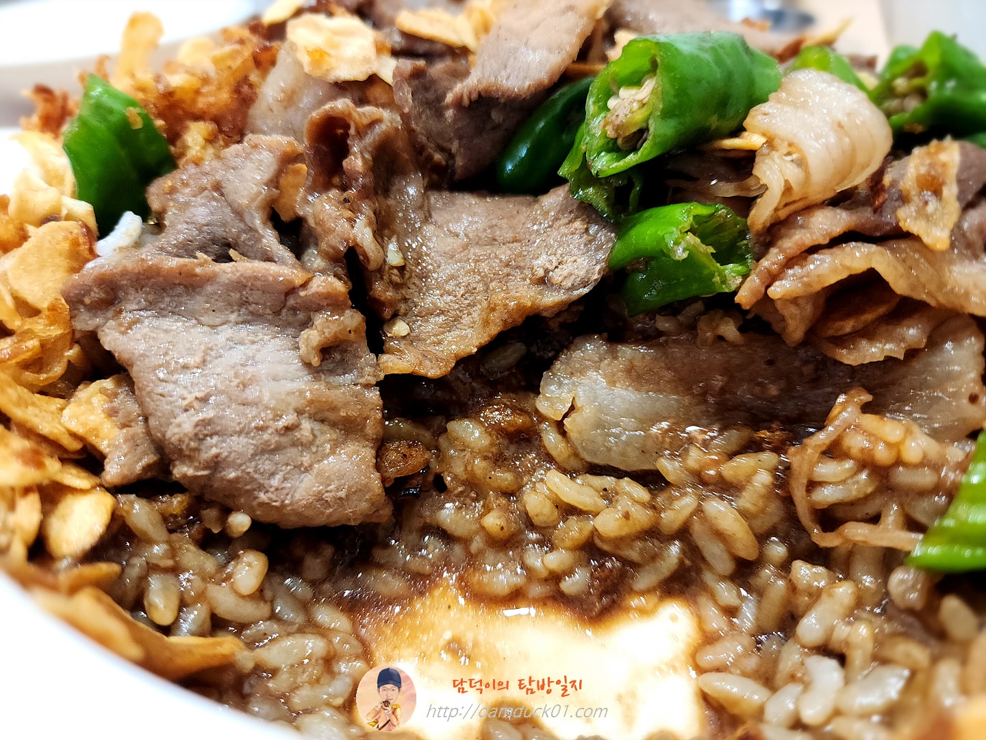 메뉴판에는 양파 후레이크라고 적혀 있지만 마늘 후레이크도 섞여 있는 거 같은데 이 후레이크와 고추의 맛과 향이 잘 어울리고 거기에 비계가 붙어 있는 부드러운 삼겹살 부위와 짭짤한 소스가 섞인 밥의 조합이 상당히 만족스럽습니다.