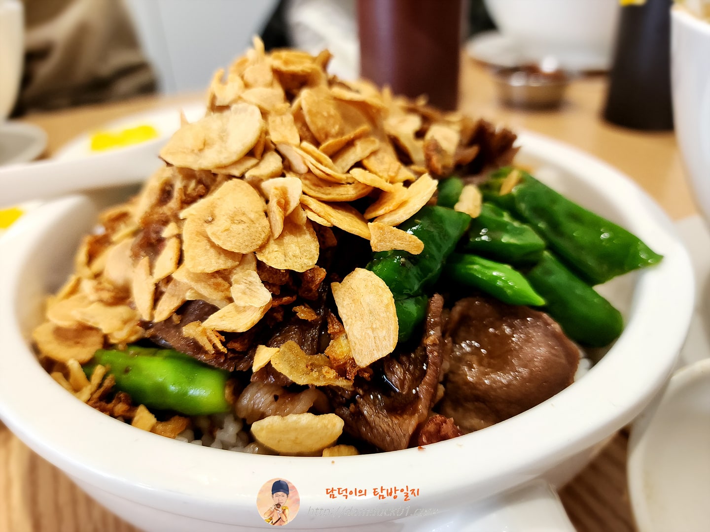 메뉴판에는 양파 후레이크라고 적혀 있지만 마늘 후레이크도 섞여 있는 거 같은데 이 후레이크와 고추의 맛과 향이 잘 어울리고 거기에 비계가 붙어 있는 부드러운 삼겹살 부위와 짭짤한 소스가 섞인 밥의 조합이 상당히 만족스럽습니다.