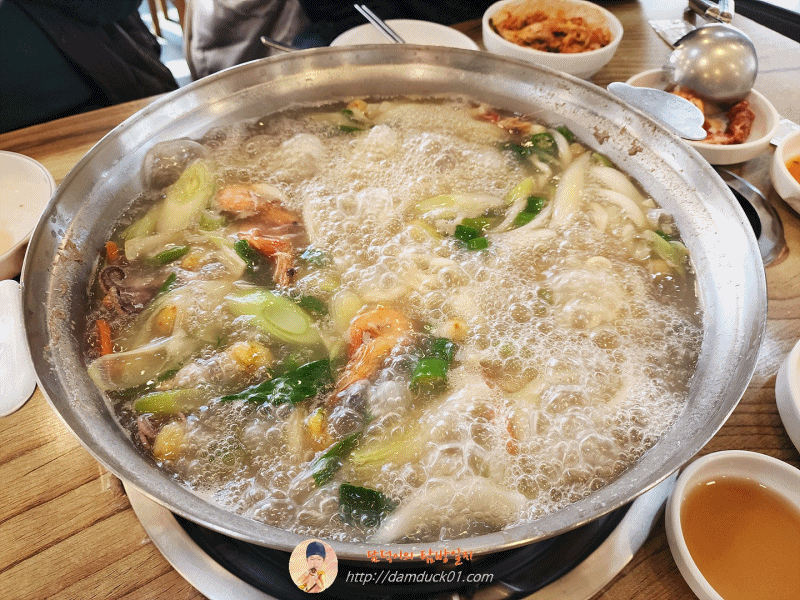 드디어 재료가 들어간 채로 팔팔 끓기 시작하는데 이때 접시에 담겨 있던 칼국수를 다 넣어주고 다시 끓기를 기다려야 합니다. 그렇게 짧지 않은 기다림 끝에 드디어 식사 시작, 탐방원이 먼저 칼국수 한 가닥을 꺼내서 먹어보고 익었다는 말과 함께 전투적인 식사가 시작됩니다. 앞접시에 칼국수를 덜고 해물을 담고 국물을 부어 준 후 한 젓가락 들어서 맛을 봅니다. 저는 이미 와 봤던 곳이고 아는 맛이라 큰 감흥은 없지만 맛있게 즐기는데 다른 탐방원 한 명이 여기는 왜 이제야 왔냐며 의미 없는 타박을 합니다. 조금만 멀리 가면 너무 멀다고 투덜대던 탐방원들인데 말이죠. 입에 잘 맞나 봅니다. 깔끔하고 시원한 국물도 좋고 쫄깃한 칼국수 면도 좋고 해물은 간장에 살짝 찍어서 먹는 맛 역시 좋습니다. 저도 그렇지만 탐방원들도 만족스러운 점심이었어요. 😁