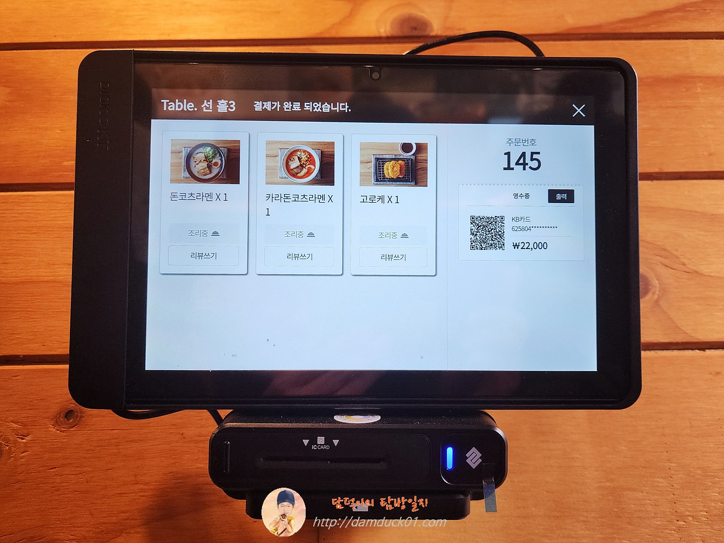 작년에는 없었는데 올해 1월에 갔을 때 본 테이블 오더로 주문과 결제를 한 번에 합니다. 탐방원은 저 포함 총 4명인데 자리가 없어서 2인 테이블에 나눠서 앉았고 제가 앉은 테이블에서는 각자 돈코츠라멘 하나와 카라돈코츠라멘 그리고 사이드로 고로케를 추가 주문했습니다. 라멘 가격은 각 9,000원이고 고로케(3개) 가격은 4,000원입니다.