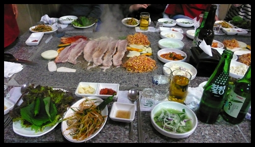 위 사진처럼 가운데 약간 파여 들어간 곳에 고기와 김치, 콩나물등을 얹어 굽고 주변의 대리석 테이블에 각종 반찬과 술 음료수가 배치되어 있는 모습.