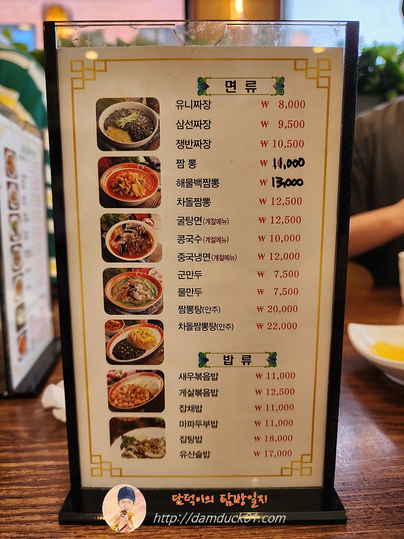 맛은 괜찮습니다. 가격이 막 비싼 느낌도 아니고요. 그런데 최근 방문 때 기대를 하고 시켰던 유니짜장이 정말 유니짜장이 아니고 그냥 일반짜장인데 유니짜장이라고 적혀서 저는 낚인 느낌이라 그제는 짜장은 제외하고 짬뽕을 먹기로 하고 메뉴판을 살펴봤습니다.