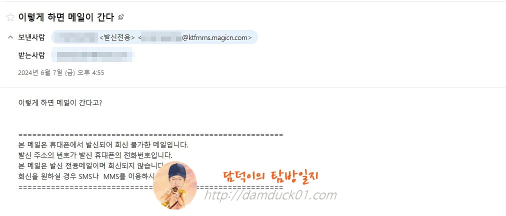 그랬더니 이렇게 메일이 왔습니다. <발신전용>으로 발신자 메일 주소가 {발신자전화번호}@ktfmms.magicn.com으로 말이죠. 저는 KT망의 알뜰폰을 사용 중이라 발신 메일 주소가 ktfmms.magicn.com으로 나오는데 아마 각 통신사 별로 발신 메일을 위한 이메일 주소를 가지고 있고 문자 메시지(MMS)로 이메일 주소로 메시지를 보내면 위와 같이 통신사 서버에서 메일 처리를 해 주는 거 같은데 신기합니다. 검색을 좀 해 보니까 SKT망은 {발신자전화번호}@vmms.nate.com으로 LG망은 {발신자전화번호}@lguplus.com으로 보내진다고 하네요. 여전히 이 기능을 얼마나 사용할지는 잘 모르겠지만 있는데 안 쓰는 것과 없거나 몰라서 못 쓰는 건 다르니까요.