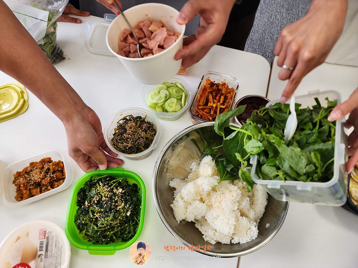 햇반이랑 참기름은 사 오고 나머지는 직원들이 집에서 가지고 온 각종 채소와 반찬들이에요.