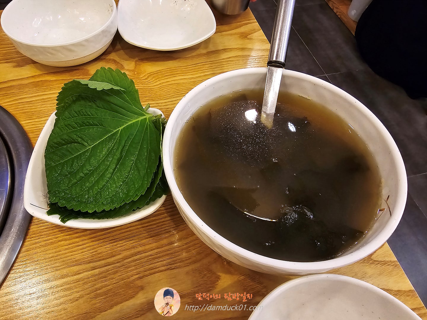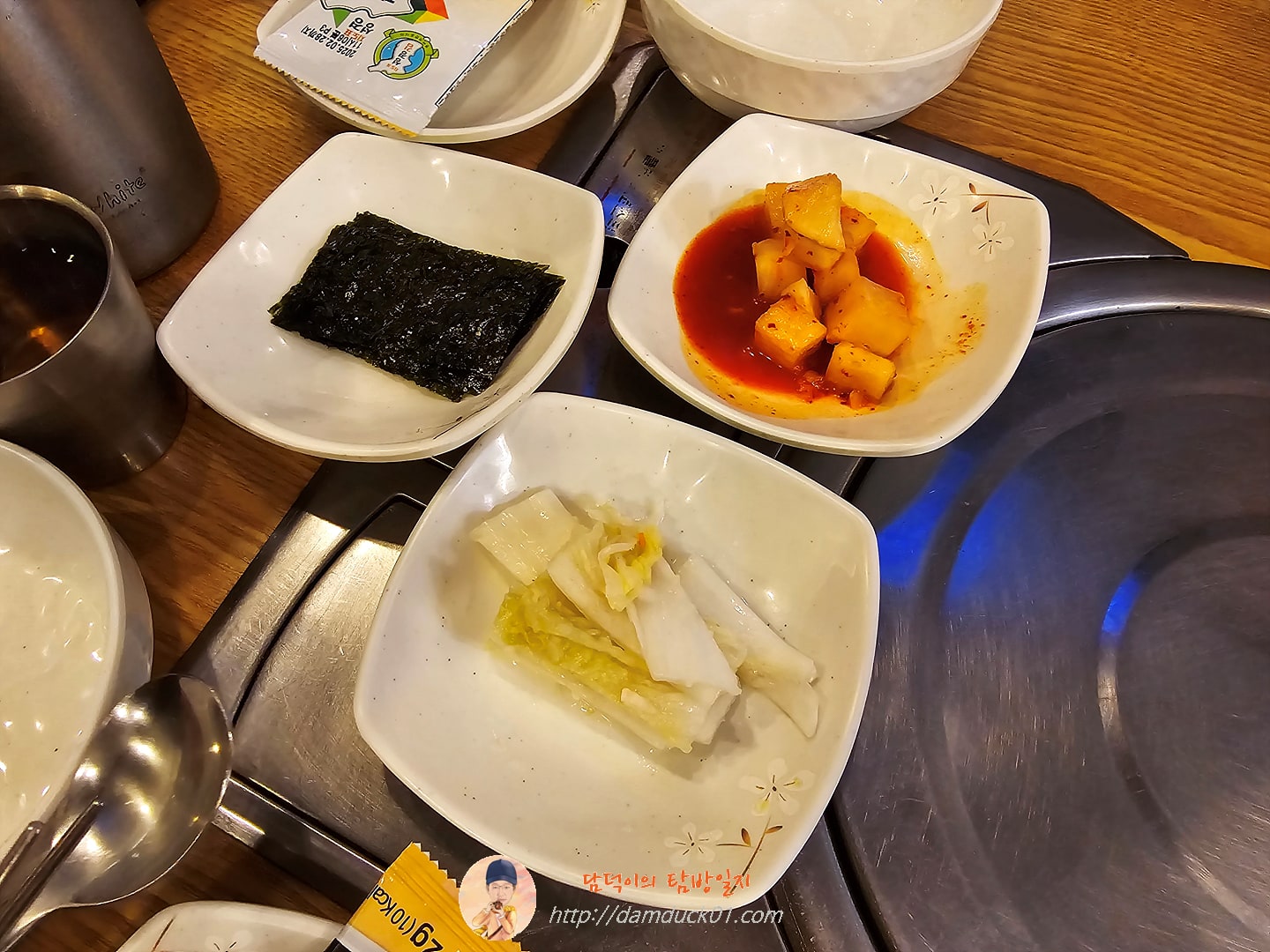 먼저 나온 강릉 엄지네 꼬막집의 꼬막비빔밥입니다. 반찬으로는 깍두기, 백김치 그리고 밥을 싸 먹을 조미김과 깻잎이 있고 미역만 넣고 끓인 미역국이 나옵니다. 본점과 비교하면 반찬 가짓수가 많이 적은 편입니다. 본점에서는 반찬이 꽤 다양하게 나왔거든요.