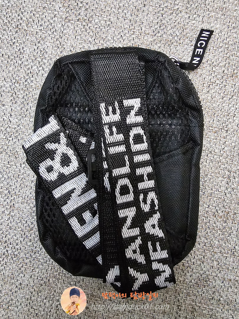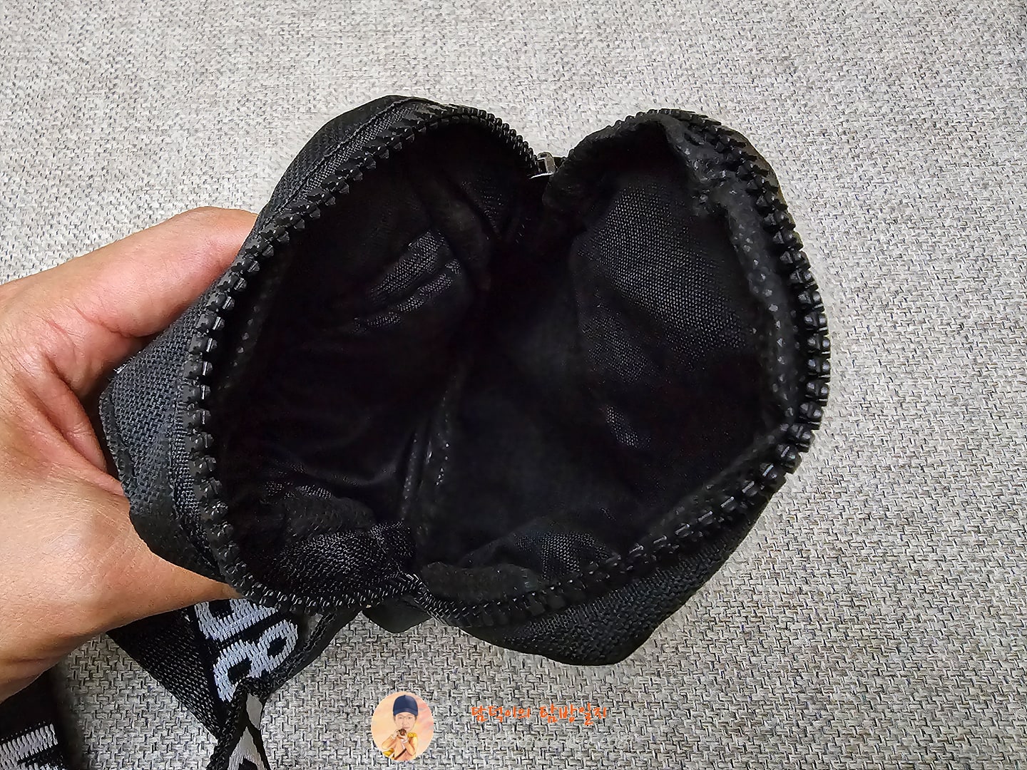 비닐을 제거하면 정말 작은 크기의 가방이 모습을 드러냅니다. 제 생각보다도 작은 크기의 가방이 도착했어요. 수납공간은 메인 공간이 하나 그리고 전면에 지퍼로 되어 있는 작은 공간이 하나 더 있습니다. 가격이 가격인 만큼 끈은 분리할 수 없는 일체형으로 되어 있어요. 살짝 실오라기가 있는 부분은 불로 지져서 셀프 마감을 조금 해 주긴 했는데 2,000원이라는 가격에 이 정도 가방이라면 충분히 괜찮은 거 같은데요.