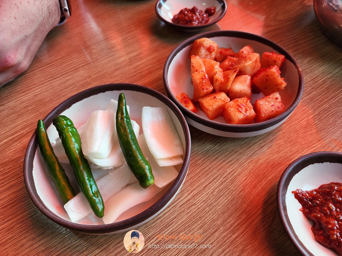 자리에 앉으면 직원 분이 쌈장과 양파, 고추 그리고 깍두기를 담을 그릇을 하나 가져다주는데요. 깍두기는 테이블에 담겨 있는 큰 그릇에서 먹을 만큼 직접 덜어 먹는 방식입니다. 그리고 여기 고추 굉장히 매우니까 매운 거 못 드시는 분들은 옆 사람에게 양보하시면 됩니다.
