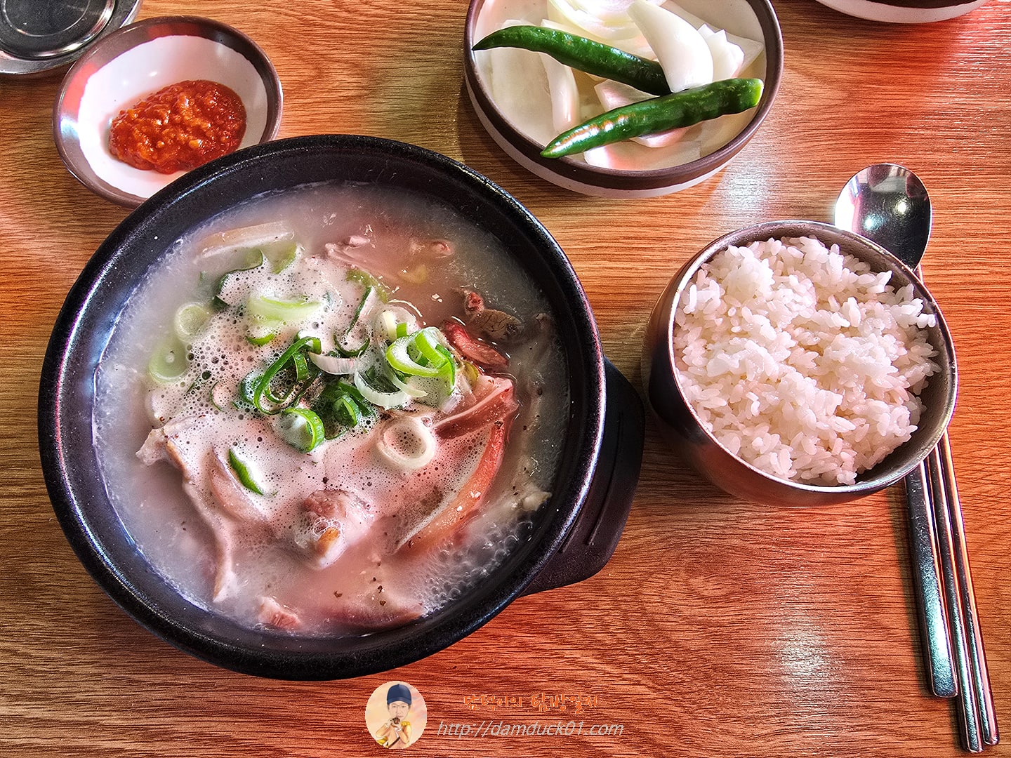 반찬으로는 쌈장과 양파, 고추가 제공되고 빈 반찬 그릇에는 테이블에 준비되어 있는 깍두기를 덜어 먹으면 되는데요. 우리 테이블은 늘 고추가 모자라서 더 주문을 합니다. 이 고추가 정말 매운데 순댓국에는 매운 고추를 같이 먹으면 더 맛있는 거 같아요. 😄