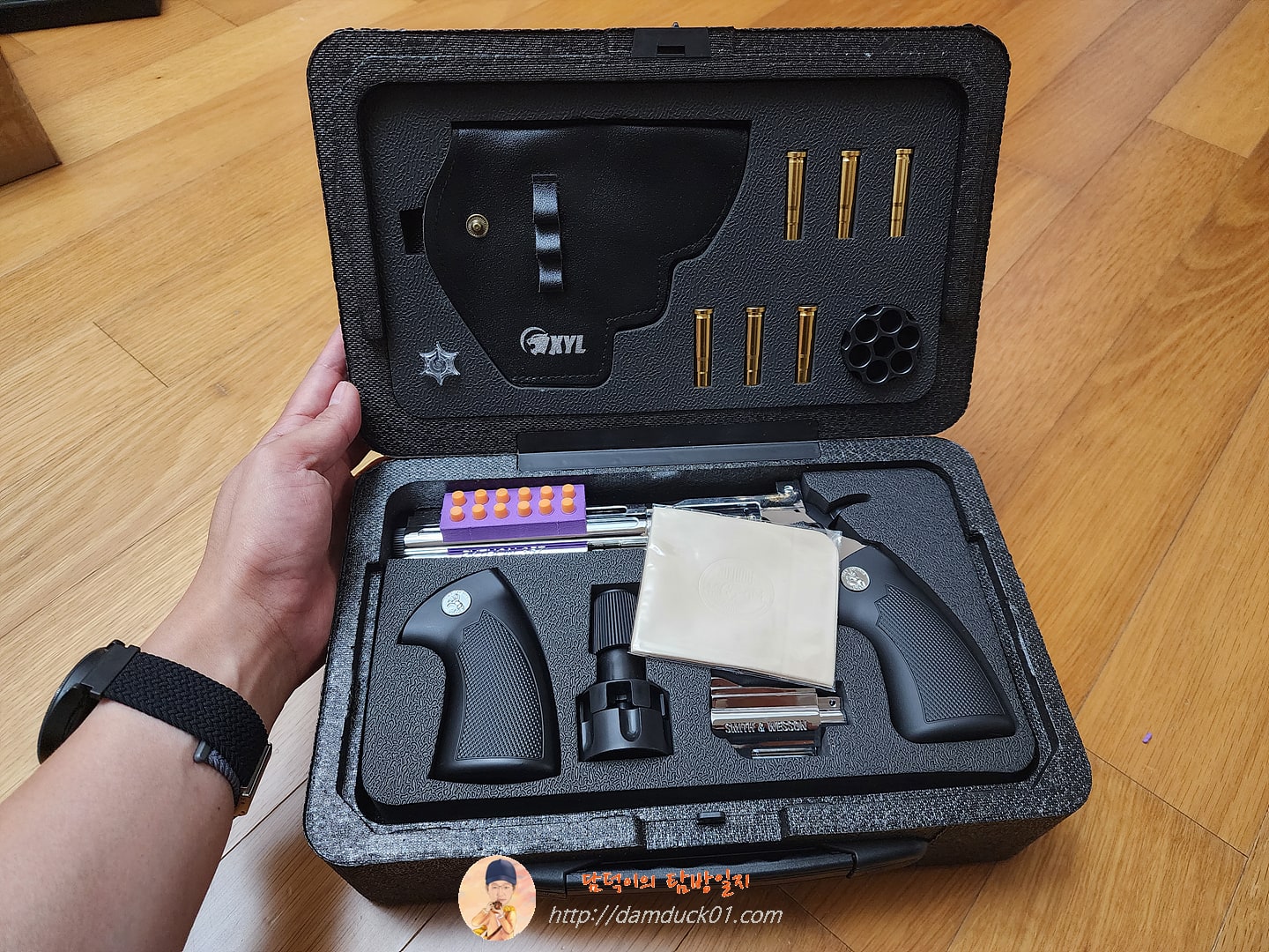 잠금장치를 풀고 가방을 열어보면 오~~~~ 멋있습니다. '리볼버 메탈 탄피배출 너프건 스미스 & 웨슨 콜트 파이슨 권총'은 총열 길이에 따라 숏버전, 미디엄 버전, 롱버전 3가지 제품이 있는데 저는 숏 버전이 가지고 싶었는데 제가 장바구니에 담을 때 옵션을 롱으로 선택했었나 봐요. 아내가 그냥 장바구니에 있는 걸 주문해서 롱 버전이 왔는데 구성품을 보면 숏, 미디엄, 롱 모두 숏버전의 총열이 함께 제공되니까 롱 버전도 나쁘지 않은 선택인 거 같습니다. 나사 하나만 풀고 조여서 숏버전과 롱버전을 모두 가질 수 있거든요.
