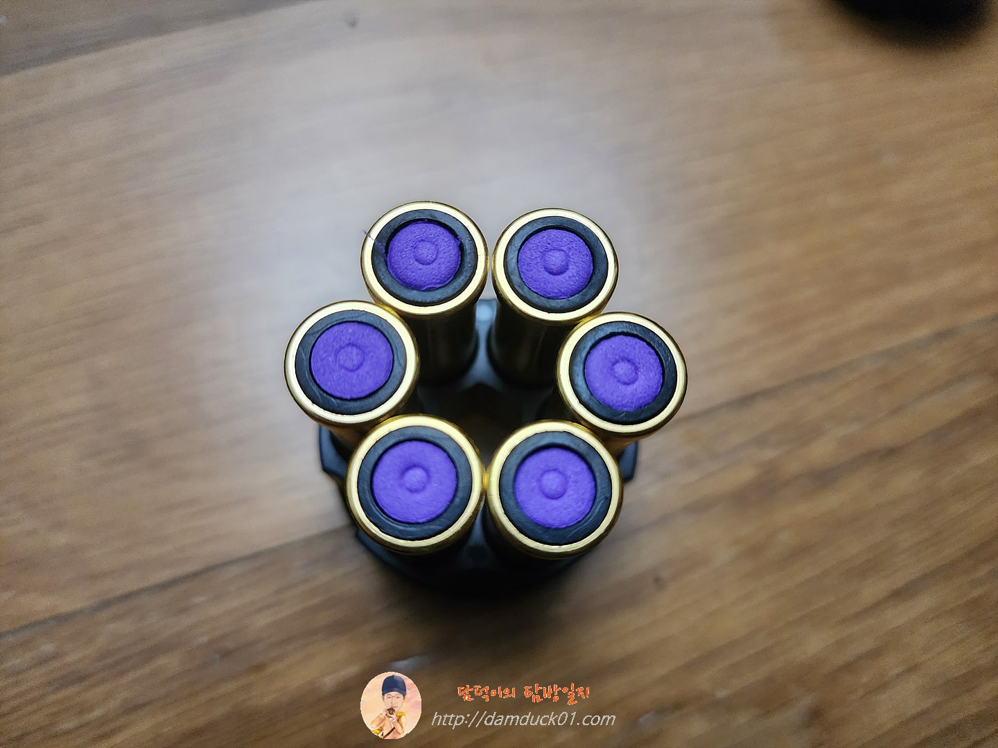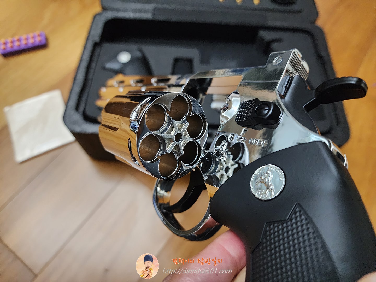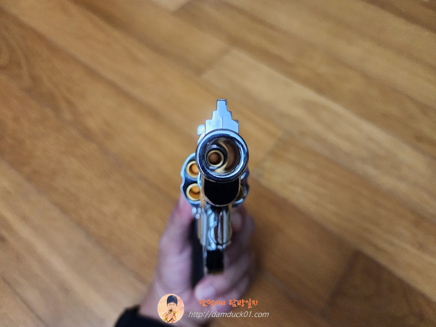 하지만 스피드 로더로 고정된 6발의 탄을 결합 후 스피드 로더의 손잡이를 누르며 착하고 장착되는 과정이나 실린더를 결합하는 구조적인 동작은 잘 작동돼서 좋습니다. 한 발씩 장전해서 발사해 보면 당연히 반동이나 이런 건 없지만 생각보다 많은 부분이 메탈로 되어 있어서 묵직함을 느낄 수 있는 것도 생각보다 좋습니다.