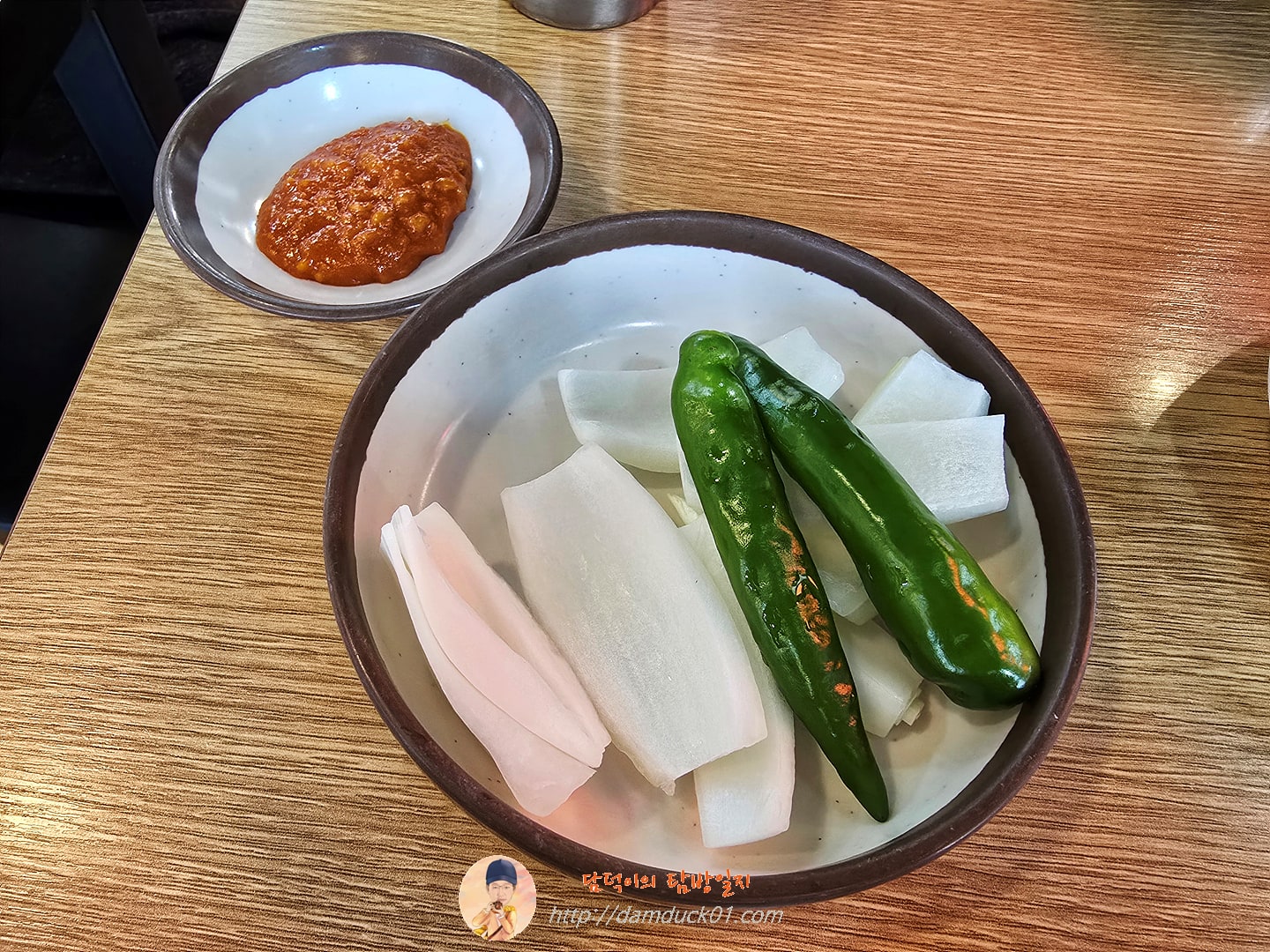 찹쌀순대 만드는집의 순댓국 섞어서가 나왔습니다. 반찬은 쌈장이랑 양파, 고추를 가져다주고 깍두기와 부추는 자리에 준비되어 있어요. 깍두기는 반찬 그릇에 먹을 만큼 덜어서 준비하고 부추는 취향껏 순댓국에 넣어 드시면 됩니다.