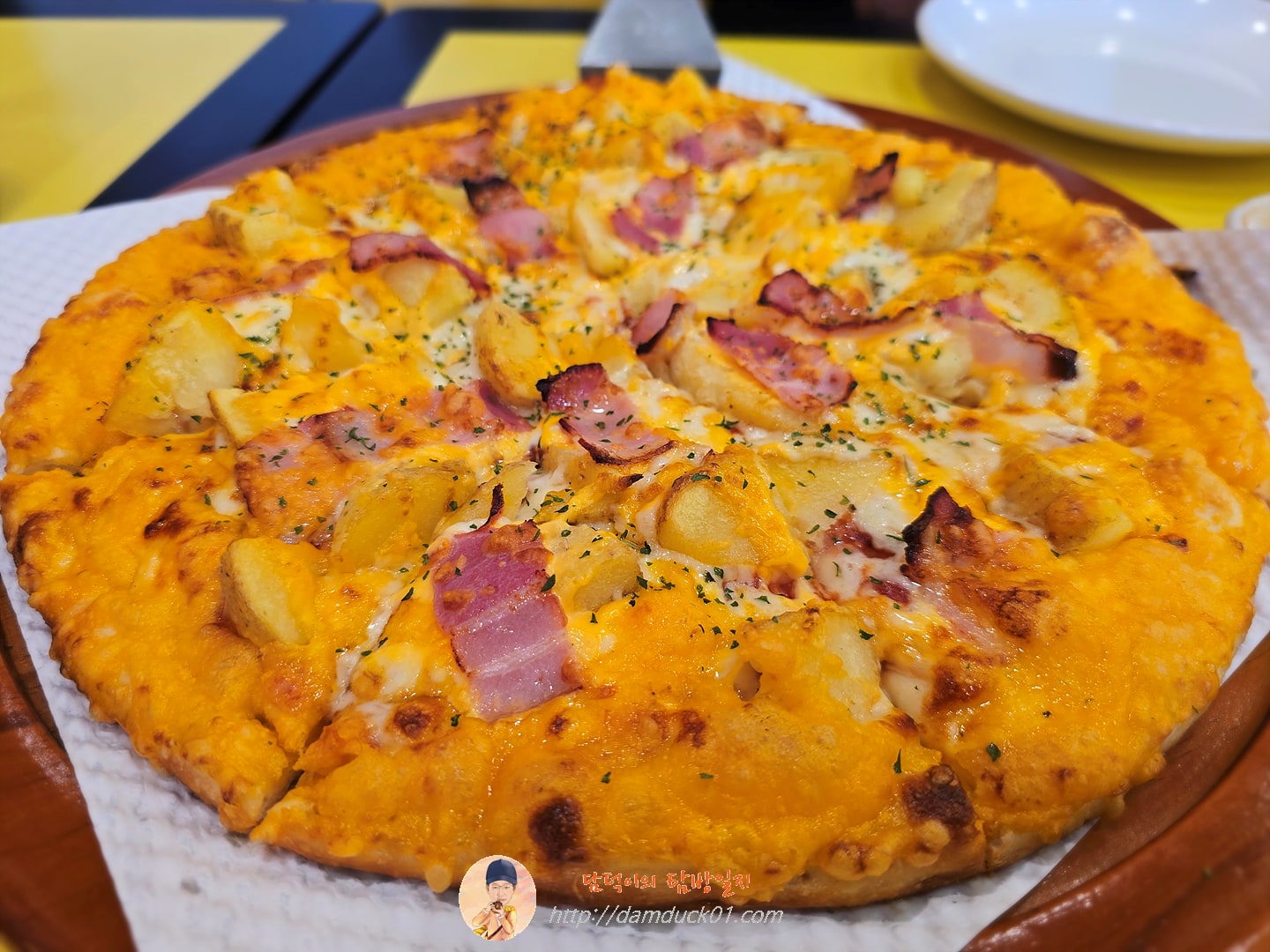 치킨스틱&윙은 따로 말할만한 게 없습니다. 맛있게 잘 구워졌어요. 닭봉과 닭날개 조합으로 총 6조각이 나오는 구성인데 맛있는 부위로 잘 구워낸 사이드 메뉴로 딱 좋은 음식입니다. 그리고 피자스쿨의 많은 피자 중 치즈가 가장 많이 들어간 것으로 생각되는 오지치즈포테이토 피자는 작년에 처음 먹어보고 딱 제 취향이라서 만족했던 피자인데요.