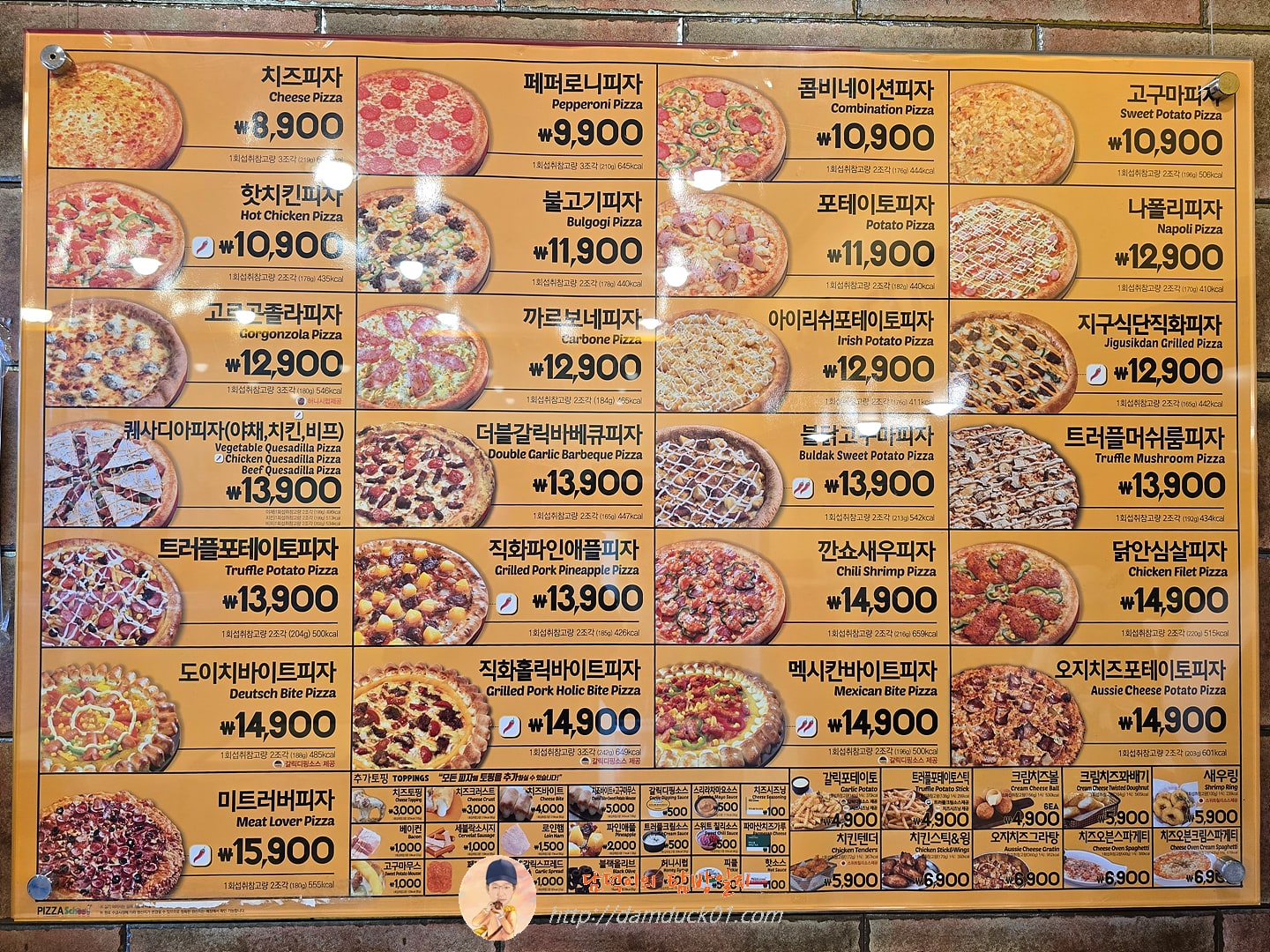 벽에 걸려 있는 메뉴판을 살펴봅니다. 아마 신메뉴들도 있겠지만 익숙한 듯 기본(?) 메뉴를 살펴보고 주문을 했어요. 우리가 주문한 건 오지치즈포테이토 피자(14,900원)와 치킨스틱&윙(6,900원) 그리고 콜라 작은 거 하나 이렇게 주문과 결제까지 마쳤습니다. 작년 10월 가격과 비교해 봤는데 피자스쿨은 가격이 오르지 않았네요. 2025년이 되고서도 가격이 유지 중인 정말 몇 안 되는 곳입니다.