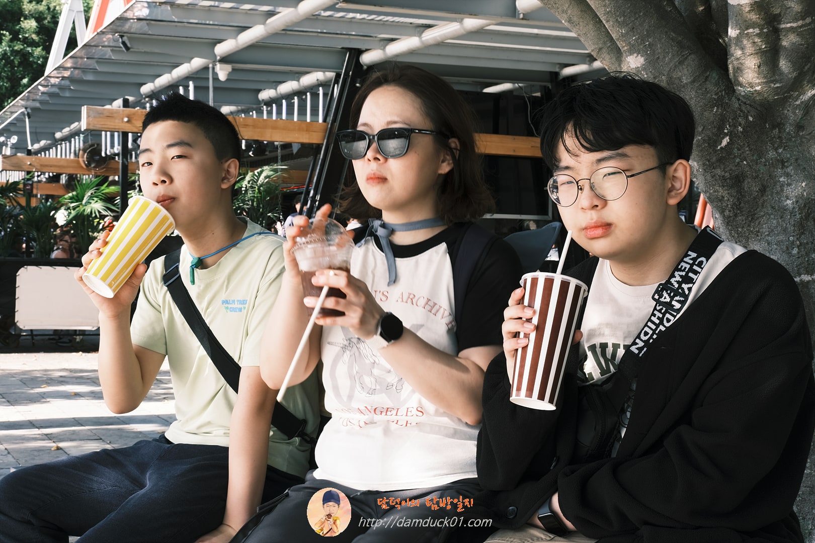 영어를 잘 못해도 어떻게든 통하게 됩니다. 우리가 허술한 영어로 이야기해도 친절하게 알아듣고 응대를 해 줍니다. 저랑 아내는 아이스 아메리카노를 주문하고 아이들은 밀크셰이크를 주문했습니다. 카페에 좌석은 없지만 괜찮습니다. 커다란 나누 밑 그늘에 벤치가 많이 마련되어 있습니다. 달링 하버를 향해 앉아서 아이스 아메리카노와 밀크셰이크로 갈증을 해소합니다.