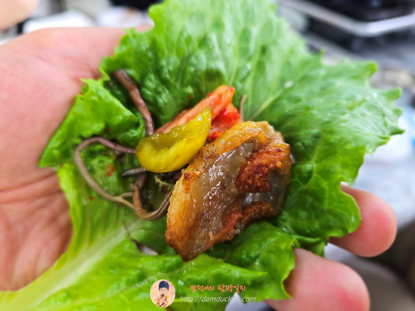 여긴 굵은소금이 나오는데 이 굵은소금에 살짝 찍어 먹고 김치 또는 나물에 싸서 먹기도 합니다. 다양한 나물과 닭구이를 싸서 먹어도 맛있고 상추에 이것저것 다 넣고 한 번에 싸 먹는 것도 좋습니다. 물론 그냥 들고 뜯어도 당연히 맛있습니다.