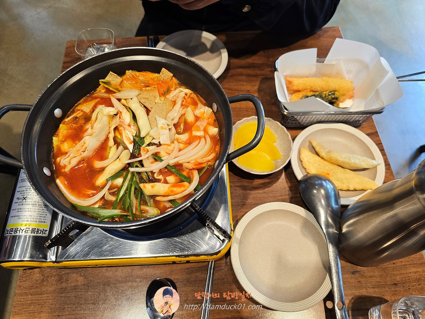 먹어도 되나 싶을 때쯤 납작 만두 두 개를 넣어주고 잠시 후 떡부터 먼저 먹으면 된다는 사장님의 말에 "네"라는 대답을 하자마자 떡 하나를 집어서 먹었는데 충분히 익어서 말랑말랑한 식감을 보여줍니다. 그런데 저는 조금 더 끓여서 먹으면 더 좋을 거 같아서 더 기다리기로 하고 납작 만두를 먹어봤는데 납작 만두 속이 특이하네요. 일반적인 당면이 아니라 넙적 당면이 들어 있는 거 같았어요. 색다른 식감이 좋았던 납작 만두를 먹고 바로 라면부터 먹었습니다. 라면은 불기 전에 먹어주는 게 원칙(?)이니까요.