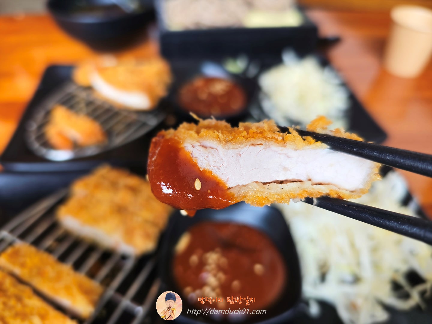 테이블 오더에는 냉소바라고 적혀 있는데 냉메밀이 아닌 판메밀입니다. 저는 냉메밀도 좋아하지만 판메밀이 더 좋습니다. 국물에 간 무와 와사비를 넉넉하게 넣어주고 잘 저어 준 후 메밀면 한 덩이를 국물에 적셔서 먹어봤습니다. 두꺼운 메밀면도 괜찮고 달짝지근한 국물 맛도 훌륭합니다. 돈가스도 쓸데없는(?) 튀김 가루가 많지 않아서인지 느끼함은 적고 정말 부드러운 맛있는 돈가스입니다. 소스에 찍어 먹었지만 소스 안 찍어 먹어도 맛있게 먹을 수 있는 돈가스입니다.