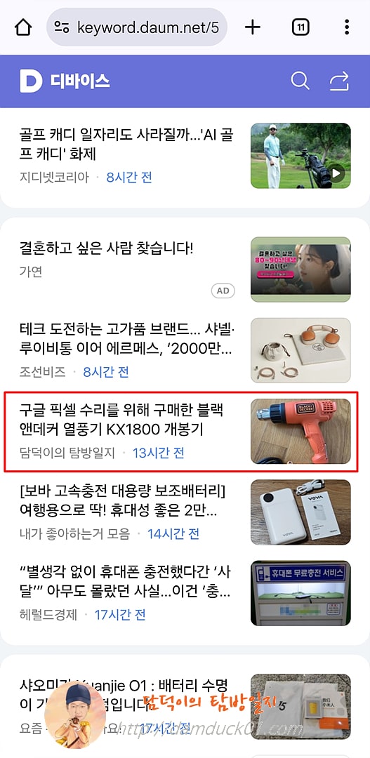 이렇게 월요일부터 금요일까지 평일에는 직장인 점심 메뉴 탐방 글이 다음 메인에 등록되었지만 2025년 5월 31일에는 IT테크 채널에 디바이스 키워드로 '구글 픽셀 수리를 위해 구매한 블랙앤데커 열풍기 KX1800 개봉기' 글이 125번째 다음 메인 등록이 되었습니다.