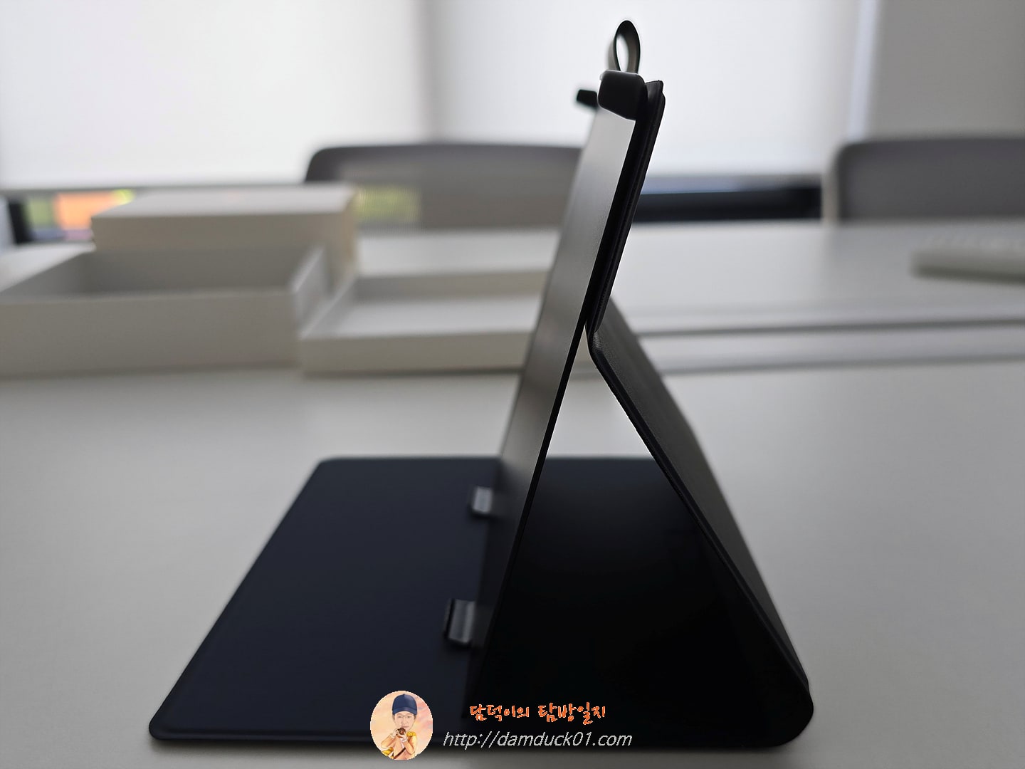 케이스를 먼저 살펴보면 전반적으로 무난합니다. 나쁘지 않은 퀄리티와 오래전부터 사용되던 각도 조절 방식을 선택하고 있고 결합 방식 역시 오래된 모서리 클립처럼 결합하는 방식이 적용되어 있는데 특이하게 좌측은 모서리가 아닌 중앙부에 2개의 클립이 적용되어 있는데 이는 USB Type-C 단자가 좌측 하단부에 위치하고 있어서 간섭을 피하기 위한 조치인 걸로 생각됩니다. 그리고 케이스 우측에는 Bigme 전용 펜을 수납할 수 있는 홀더가 달려 있습니다.