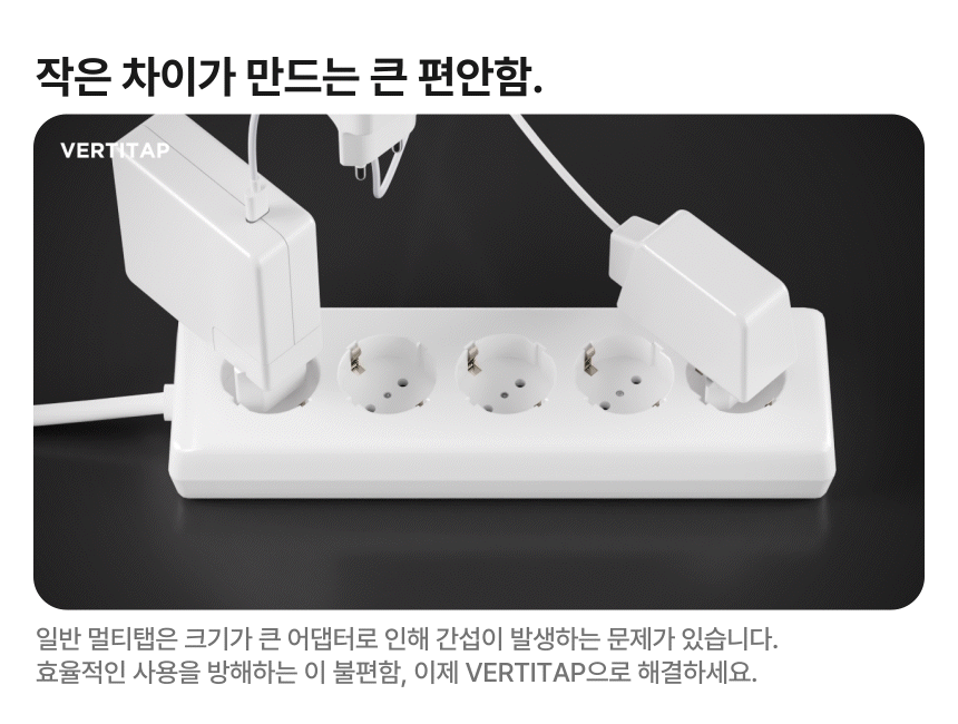 바로 위와 같은 경우인데 저 같은 경우에도 회사에서 6구 멀티탭을 사용하고 있지만 모니터 플러그가 어댑터와 결합된 형태로 간섭이 생겨서 4구만 사용하고 2구는 사용하지 못하고 있는데 버티컬 시리즈를 사용하면 오히려 1구가 남는 상황이 연출됩니다.
