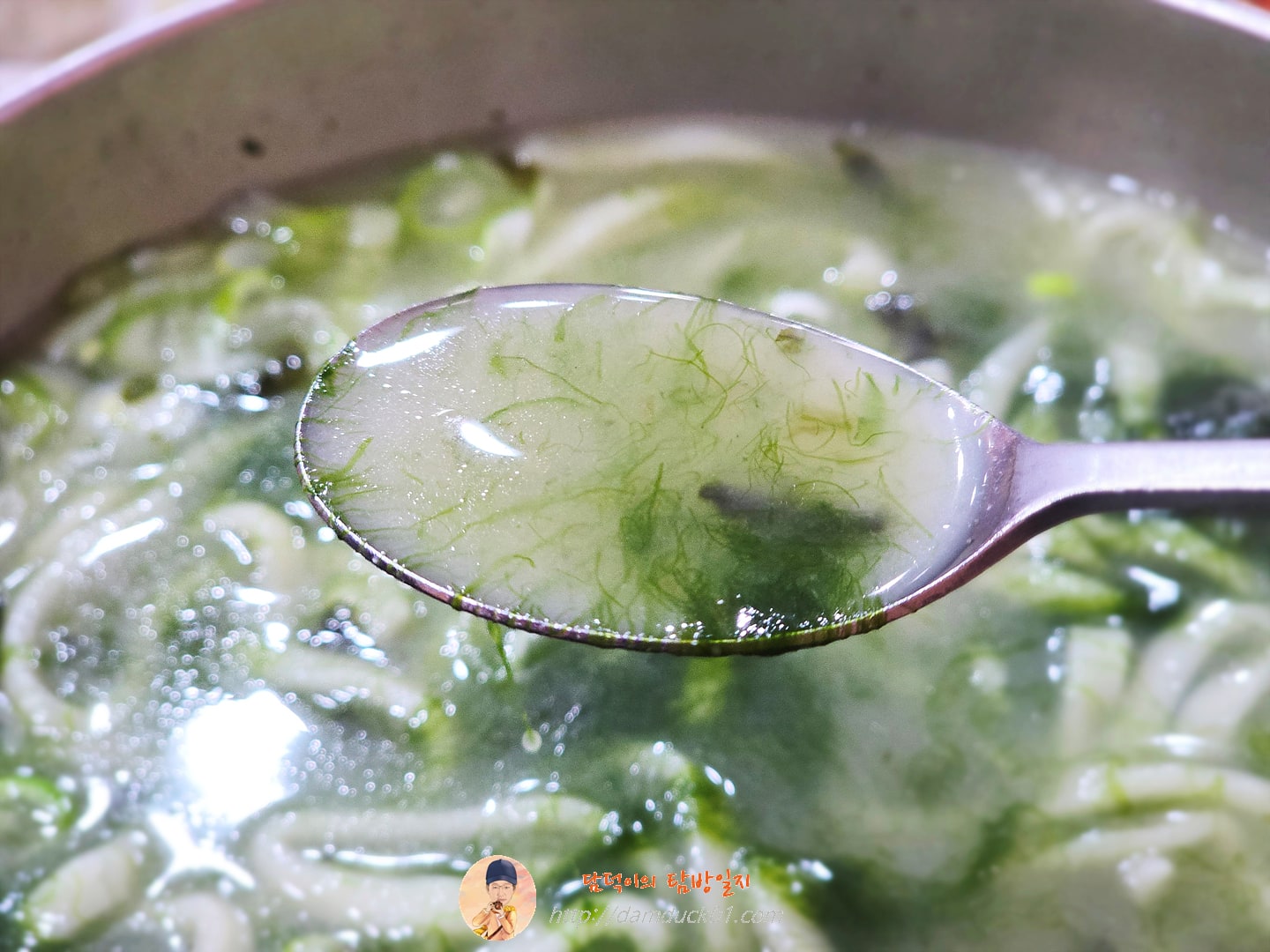 이제 처음 먹어 본 매생이 칼국수에 대해 이야기해 드릴게요. 아주 오래전에 매생이국은 먹어 본 적이 있는데 매생이 칼국수는 처음입니다. 일단 잘 섞어 준 후 국물을 한 숟가락 떠서 먼저 맛을 봅니다. 분명 닭칼국수와 같은 국물맛인데 뭔가 미묘하게 다른 맛이 납니다. 닭칼국수 국물의 진함이 조금 약해진 거 같고 대신 시원하고 가벼운 맛이 나는 느낌입니다. 여기에 매생이의 그 미묘한 식감이 분명 나쁘지 않고 나름의 다른 매력을 뿜어냅니다.