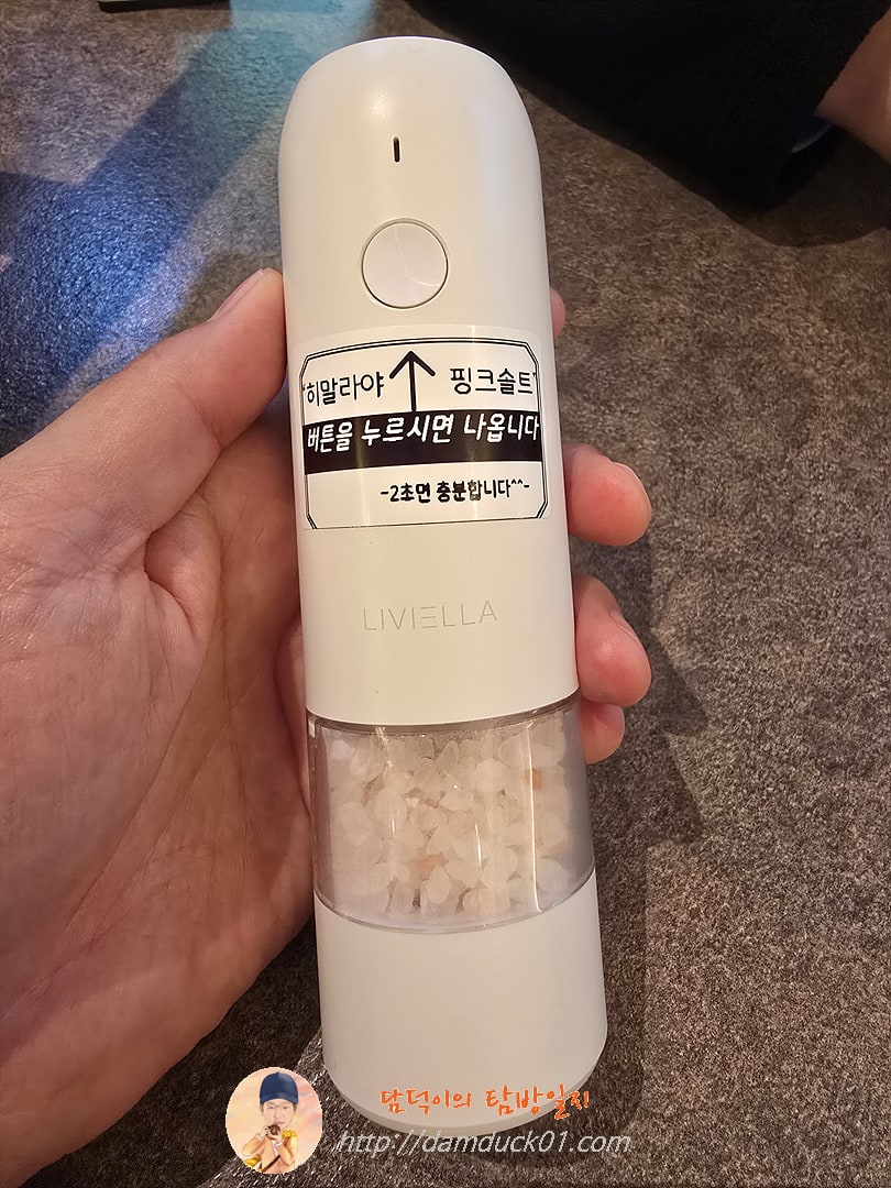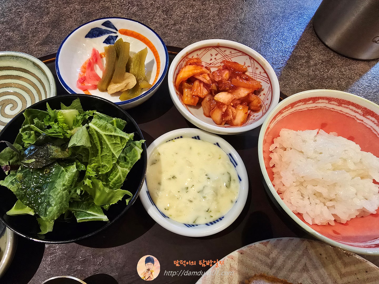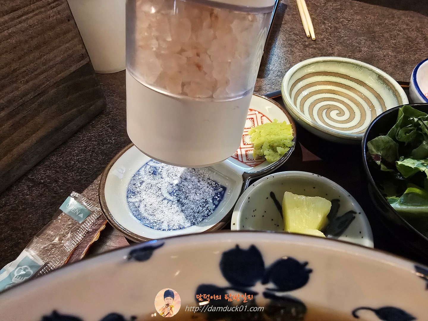 유부초밥과 와사비, 테이블에 있는 돈가스 소스를 담을 빈 그릇, 파인애플, 궁채절임과 생강절임, 배추김치, 쌀밥, 타르타르소스, 샐러드까지 돈가스집에서 이렇게 다양한 반찬을 만나는 건 처음인 거 같습니다. 가장 먼저 유부초밥을 먹고 난 후 유부초밥이 담겨 있던 그릇에 히말라야 핑크솔트가 들어 있다는 전동 그라인더의 버튼을 눌러 덩어리 소금을 갈아 담으면 본격적인 식사 준비가 끝이 납니다.