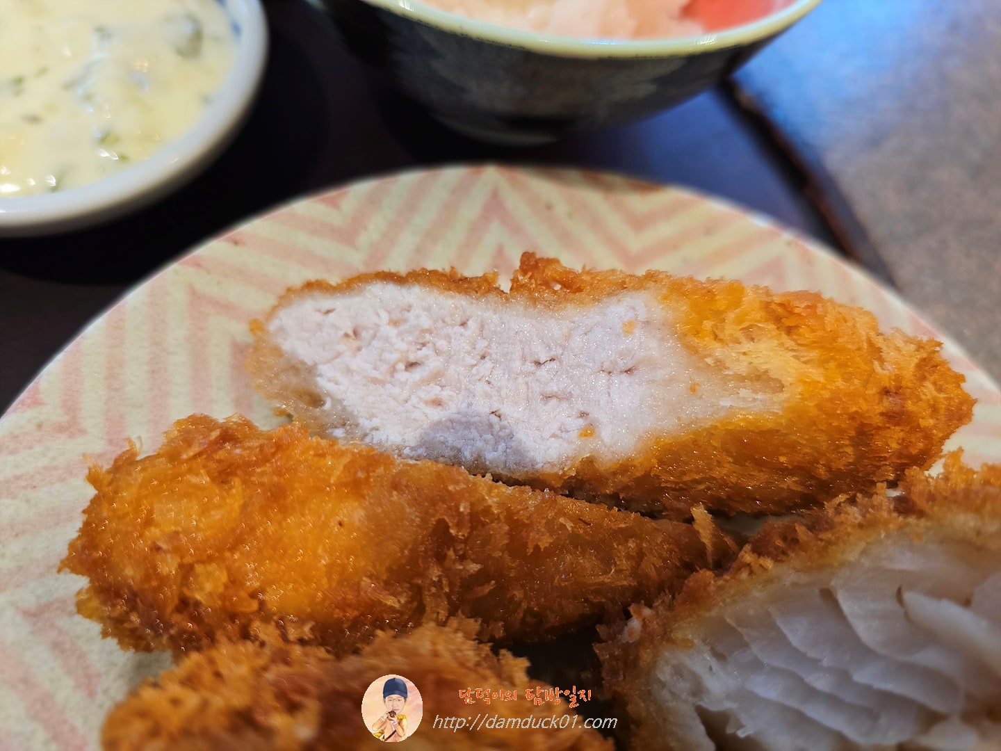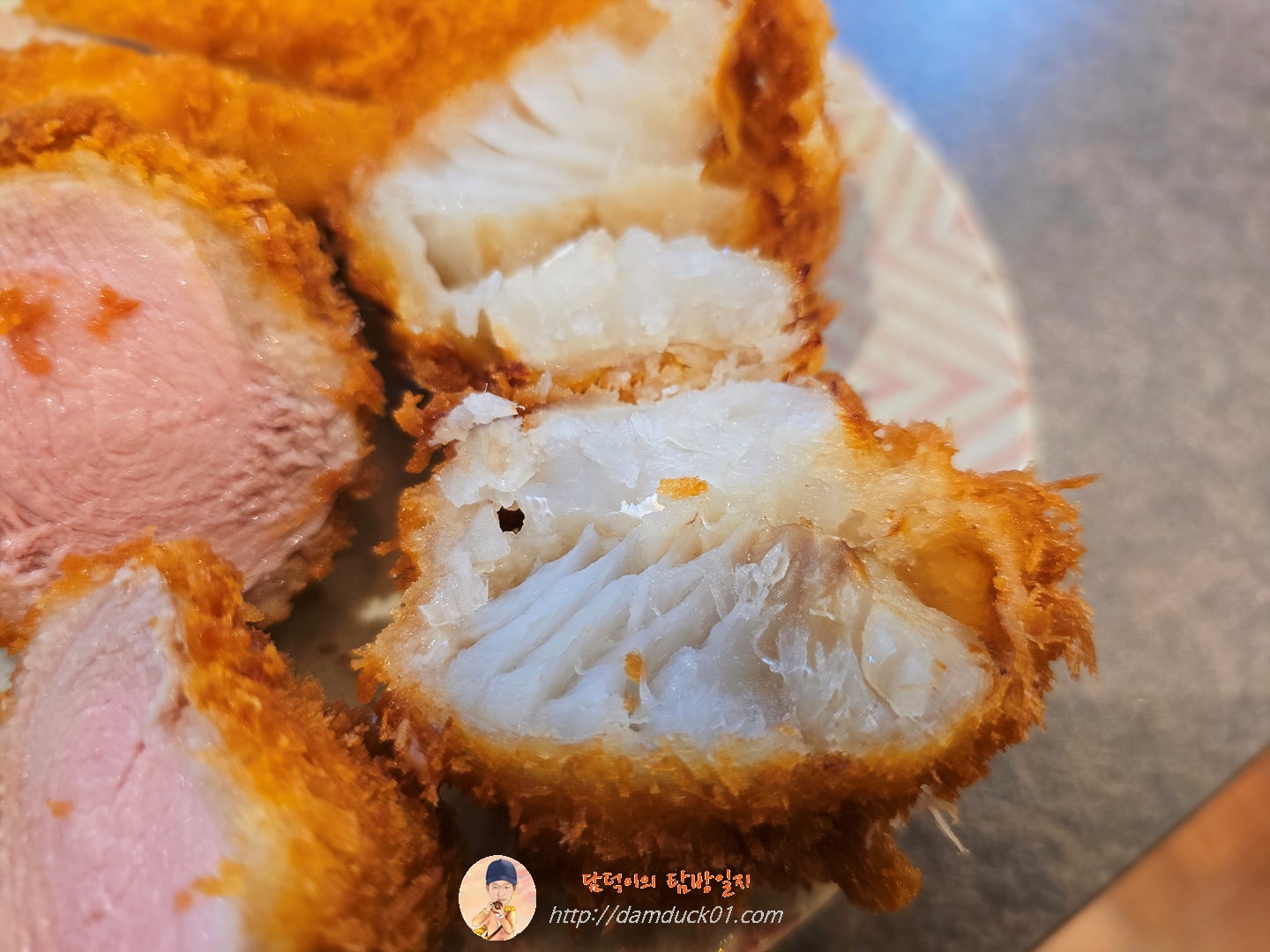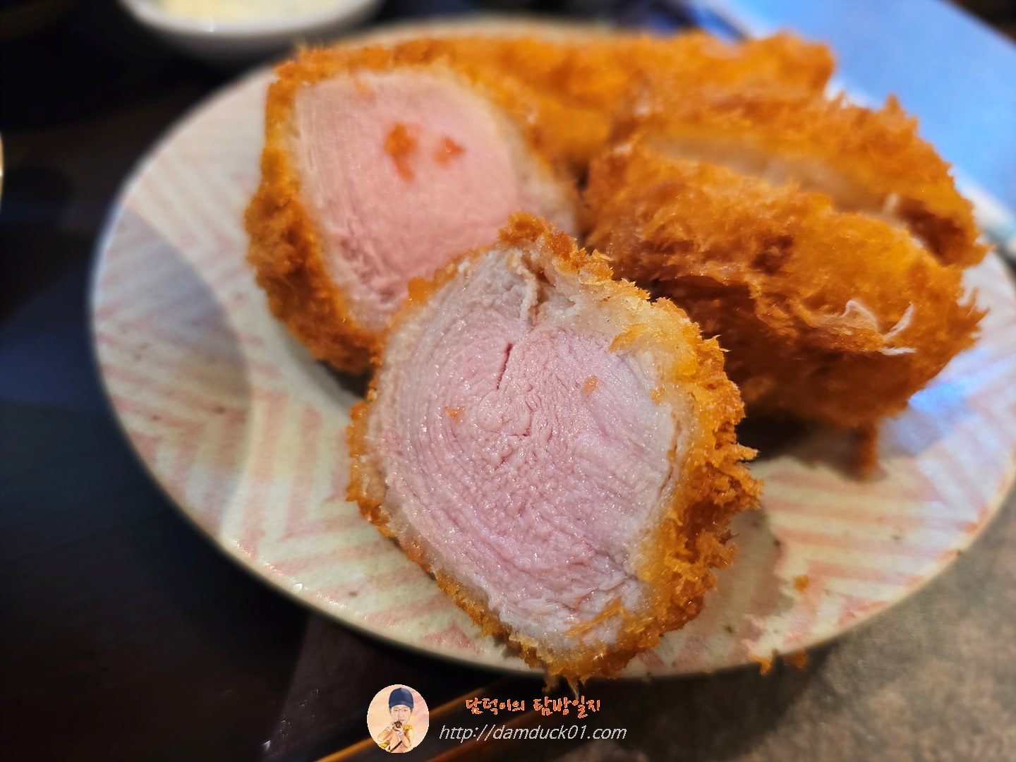 기대가 컸던 안심돈가스는 음~ 핑킹 현상이 있다고 무조건 맛이 있는 건 아니라는 걸 알았습니다. 안심돈가스인데 이상하게 부드러움보다 퍽퍽함이 더 느껴지는 돈가스였습니다. 반면 등심돈가스는 기대이상입니다. 어쩌면 비주얼에 오는 기대감의 차이일지도 모르겠습니다. 안심돈가스의 화려한 비주얼에 비해 등심돈가스는 무난해서 별 기대를 안 하고 먹었던 걸까요? 등심돈가스와 안심돈가스의 차이가 별로 느껴지지 않습니다.
