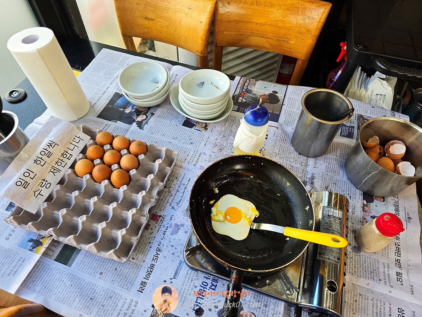 주문을 하고 음식을 기다리는데 좌측에 "단백질 보충 달걀 프라이"라는 글씨가 보입니다. 손님이 직접 달걀 프라이를 할 수 있는 곳이 있습니다. 이걸 안 먹을 수는 없죠. 바로 달걀 프라이를 하러 갑니다. 무제한은 아니고 일인 한알씩 제한이 있습니다. 프라이팬과 식용유, 소금이 준비되어 있습니다. 노른자가 터지지 않게 달걀을 깨서 넣고 소금을 솔솔 뿌려준 후 노른자가 익기 전에 뒤집어 줍니다. 이렇게 노른자는 코팅만 되게 하고 흰자만 익혀서 3개의 달걀 프라이를 만들어서 가져왔습니다.
